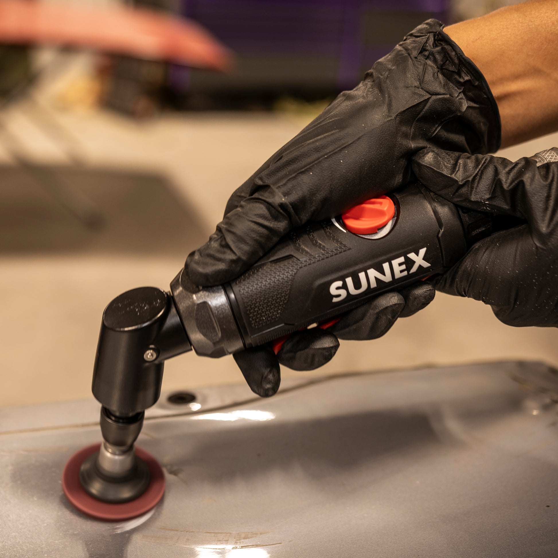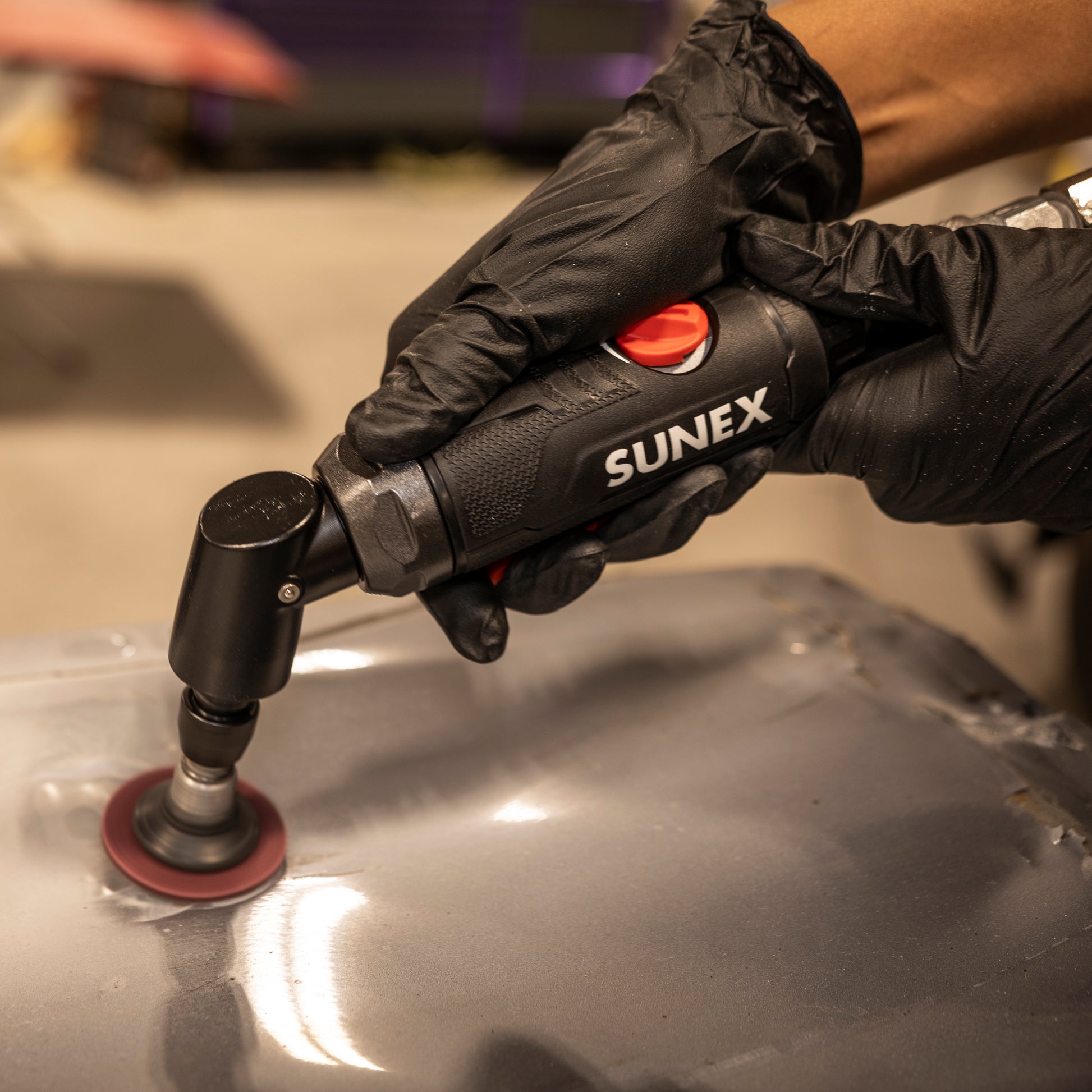 - The SUNEX Tools SX5204 0.5HP 115-Degree Angle Die Grinder is built for power, control, and accessibility in demanding applications. Its high-performance 0.5HP motor delivers the speed and torque needed for porting, weld grinding, polishing, and gasket removal. The 115-degree angle head design provides optimal access to tight, awkward areas—perfect for auto bodywork, brake cleaning, and weld dressing. Equipped with a precision 3-piece 1/4" collet, this grinder ensures secure accessory retention and consistent performance across a range of grinding tasks. The adjustable power regulator offers precise speed control for efficient material removal and reduced surface damage. Its lightweight 1.6 lb composite body and ergonomic overmold grip reduce vibration and fatigue during extended use. A safety lock-off trigger prevents accidental activation, while the rear exhaust system keeps air and debris away from your workspace for improved visibility. Running at 18,000 RPM and consuming only 6.0 CFM at 90 PSI, the SX5204 is compatible with standard air systems and integrates easily into any professional shop setup. Whether you're working under the hood or on detailed finishing, this angle die grinder offers the reach and control you need for precision work.