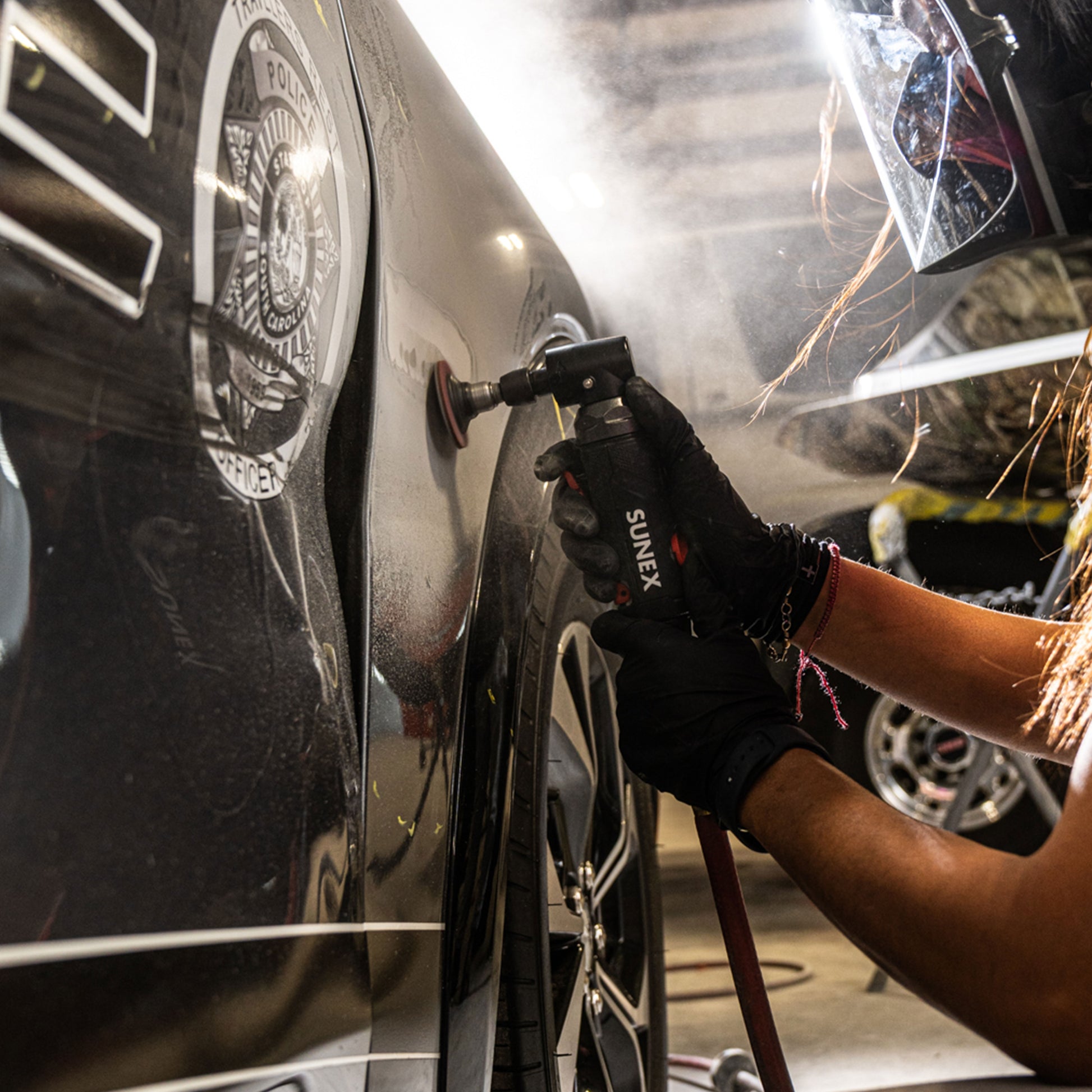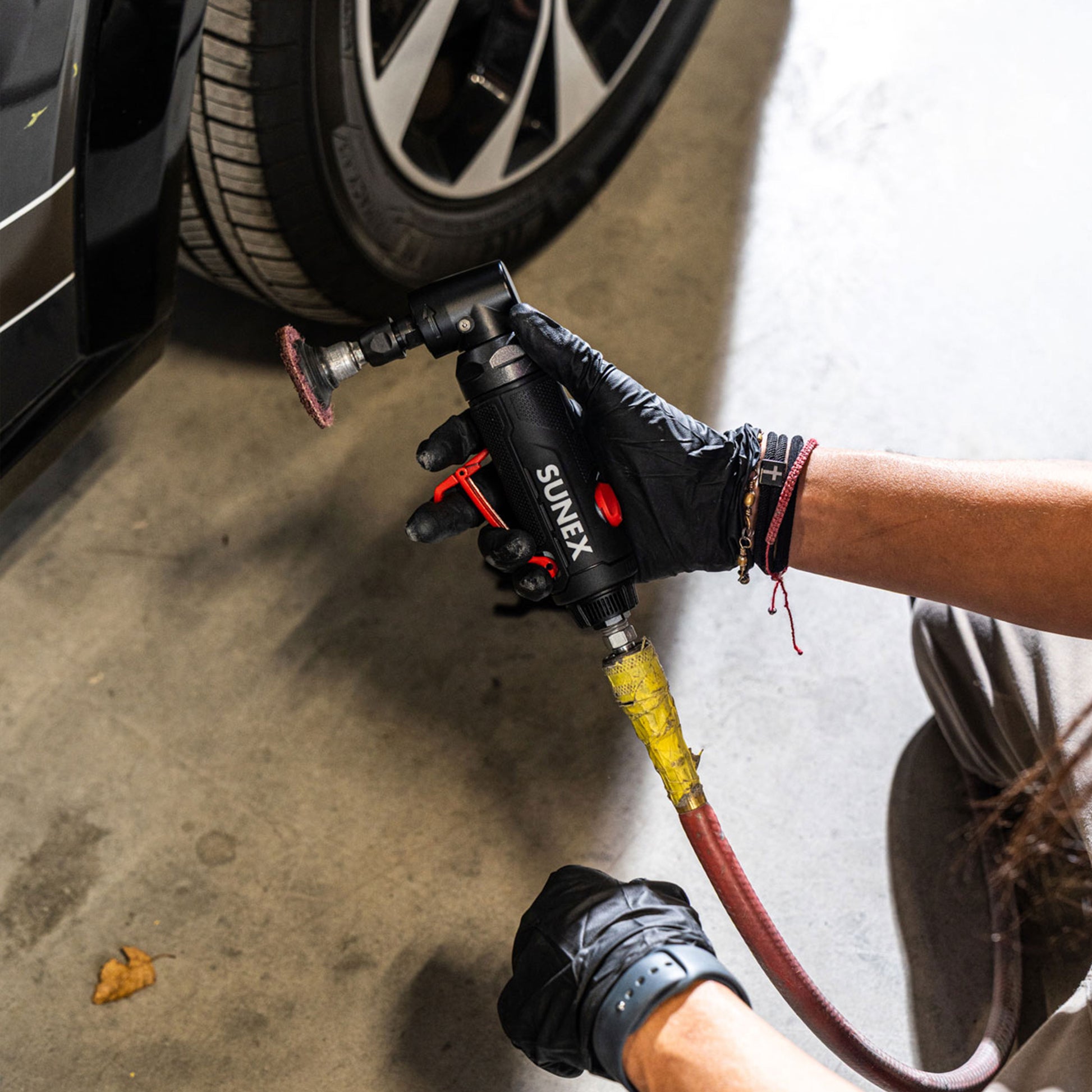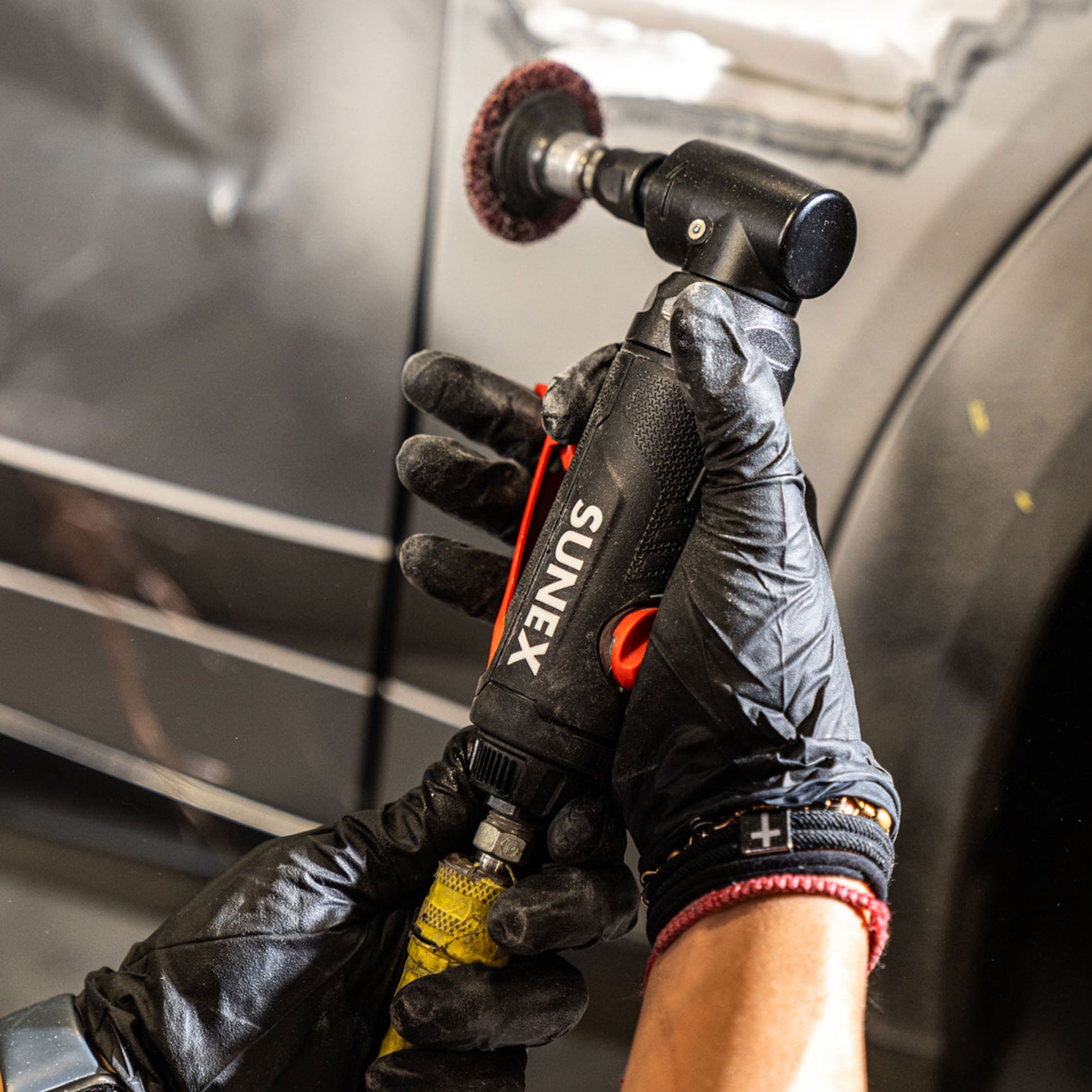 - The SUNEX Tools SX5208 0.5HP 90-Degree Angle Die Grinder is engineered for performance, precision, and accessibility in tight workspaces. Featuring a powerful 0.5HP motor, this high-speed grinder is built for demanding tasks like weld breaking, porting, polishing, and deburring. The precision 3-piece 1/4" collet ensures secure accessory retention, while the 90-degree angle head design provides better access in confined areas such as engine bays, under dashboards, and chassis work. With an adjustable power regulator, you can fine-tune speed and power for optimal results across various materials and applications. Weighing just 1.54 lbs, the lightweight composite body reduces user fatigue without compromising durability. An ergonomic overmold grip delivers a secure, comfortable hold and minimizes vibration during extended use. Safety is enhanced with a lock-off trigger to prevent accidental start-ups in busy shop environments. The rear exhaust system directs air and debris away from the user and work surface, helping maintain a cleaner, more visible workspace. With a free speed of 20,000 RPM and efficient 3.5 CFM air consumption at 90 PSI, the SX5208 is compatible with most shop air setups and built for all-day use. Perfect for precision work in compact spaces, this tool delivers control, power, and reliability.