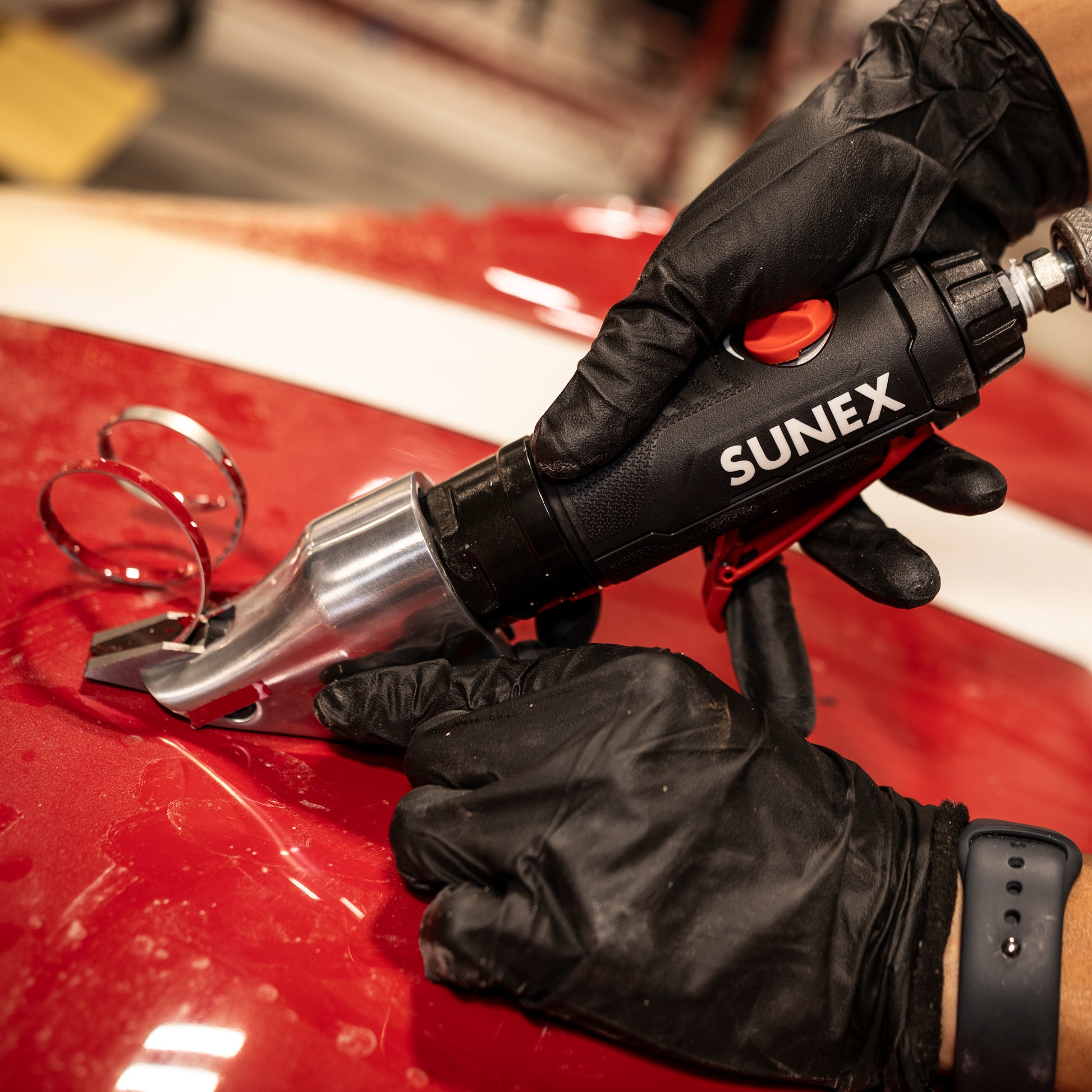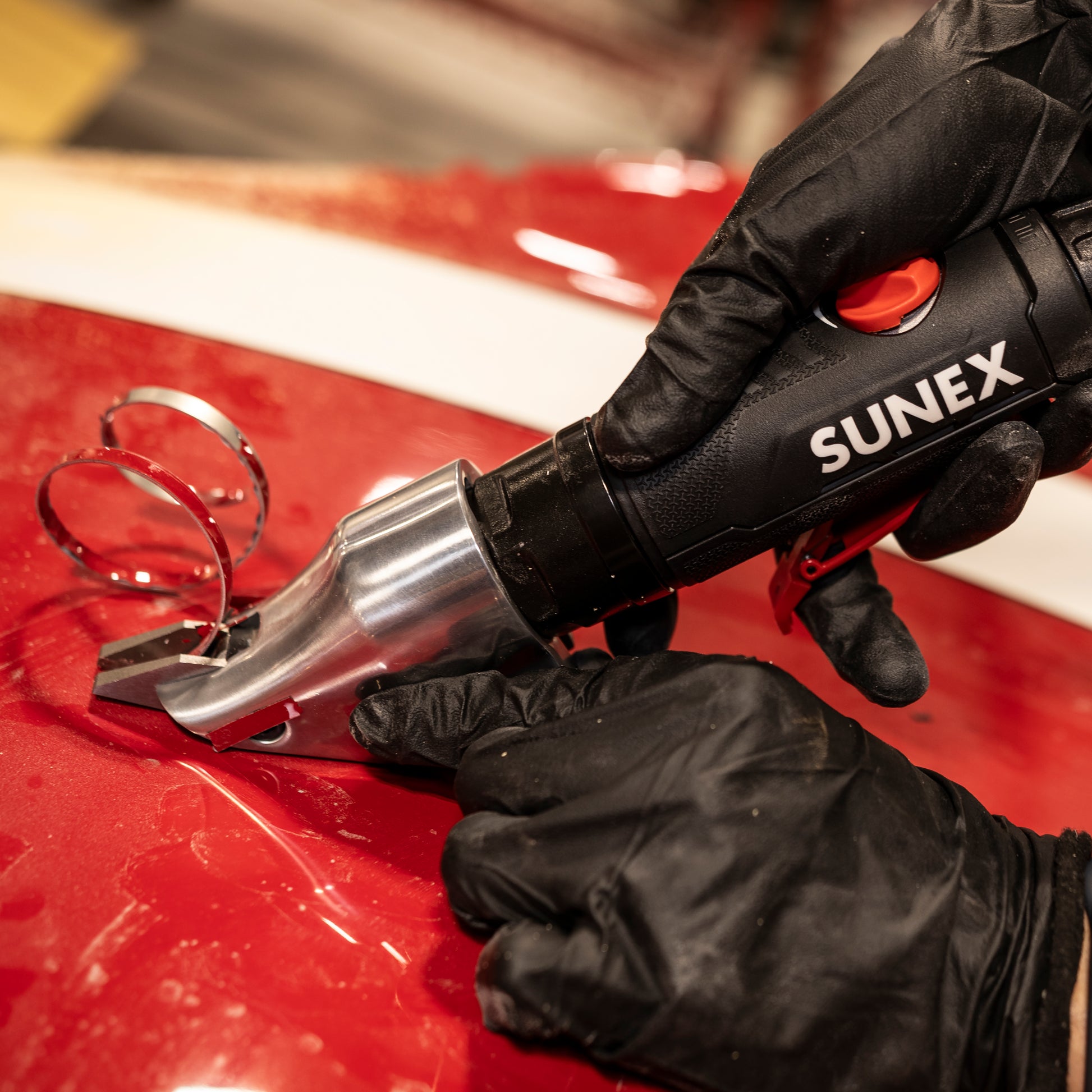 - The SUNEX Tools SX6211 0.5HP Air Metal Shear delivers professional-grade power and precision for clean, controlled cutting through sheet metal, plastic, and aluminum up to 18 gauge. Featuring a strong 0.5 horsepower motor and 2,600 SPM free speed, this pneumatic shear ensures fast, consistent performance for auto body repair, fabrication, and HVAC applications. The durable aluminum shear head is engineered for long-lasting accuracy when cutting straight, curved, or angled lines, while the adjustable power regulator allows you to fine-tune speed and control for different materials, reducing distortion and rework. Designed for comfort and efficiency, the lightweight 2.2 lb composite body minimizes operator fatigue, and the ergonomic overmold grip provides a secure, non-slip hold. A safety lock-off trigger prevents accidental starts, and the rear exhaust system directs air and debris away from the work surface for improved visibility and cleanliness. With efficient 3.1 CFM air consumption at 90 PSI, the SX6211 integrates seamlessly into any professional shop setup. Built for reliability, comfort, and precision, the SUNEX Tools 0.5HP Air Metal Shear is a must-have for automotive and metal fabrication professionals.