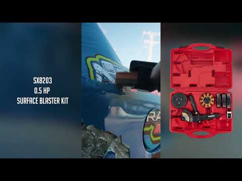 - The SUNEX Tools SX8203 0.5HP Surface Blaster Kit is your go-to solution for fast, powerful surface removal and prep. Equipped with a strong 0.5HP motor and planetary gear system, this blaster delivers enhanced torque and long-term durability—perfect for removing rust, paint, adhesives, undercoating, and more. Its 6" wheel capacity with protective guard offers safety and compatibility with a wide range of surface prep wheels. The 180° rotating handle improves accessibility in tight or awkward areas, making it ideal for detailed bodywork or restoration jobs. A complete surface removal kit, it includes 5 wheels: (1) rubber eraser, (3) wire wheels (2 - coarse, 1 - fine), and (1) stripping wheel to cover multiple applications. The adjustable power regulator ensures precision control across materials. The lightweight 2.7 lb composite body with an ergonomic overmold grip minimizes fatigue while increasing comfort and control. A safety lock-off trigger prevents accidental startups, and the rear exhaust system keeps debris away from the workspace. The SX8203 0.5HP Surface Blaster Kit includes: Coarse Wire Wheels (2), Fine Wire Wheel (1), Stripping Wheel (1), Eraser Wheel (1), Hub (1) and a Heavy-Duty Storage Case. Running at 4,000 RPM free speed and just 3.5 CFM at 90 PSI, the SX8203 delivers professional results with shop-friendly efficiency.