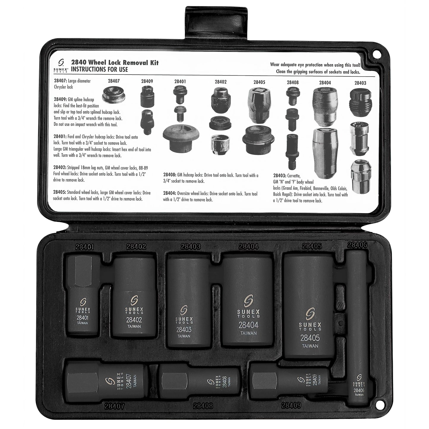 - 1/2" drive ford and chrysler wheel lock removal tool, Removal tool for ford wheel locks and 18mm gm lug, Removal tool for corvette, Removal tool for oversize wheel locks, Removal tool for specialty wheel locks and gm hubcap, Removal tool for chrysler hubcap locks