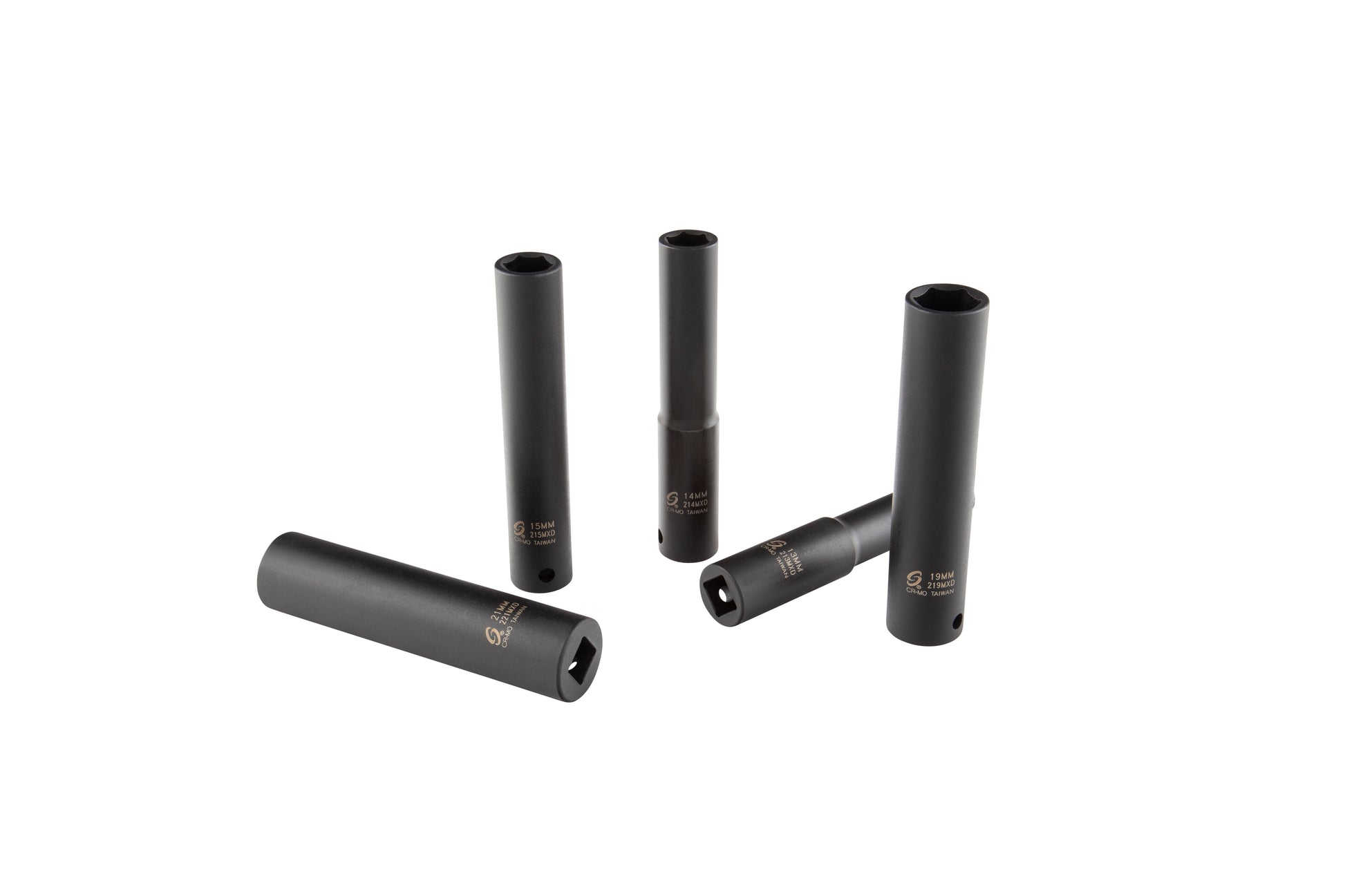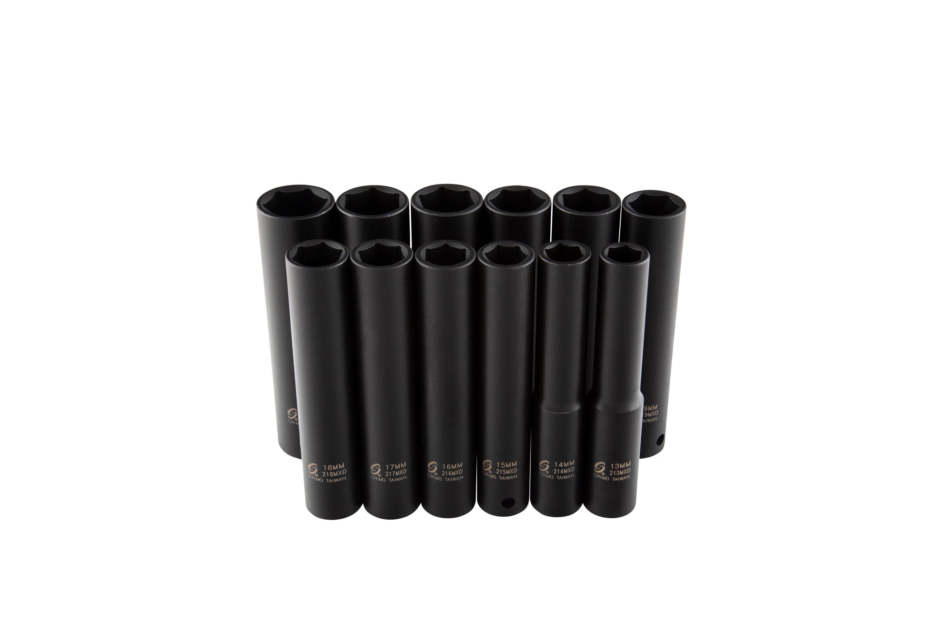 - 3/8” Drive 6 Point Extra Deep Metric Impact Sockets (12): 13mm, 14mm, 15mm, 16mm, 17mm, 18mm, 19mm, 20mm, 21mm, 22mm, 23mm, 24mm