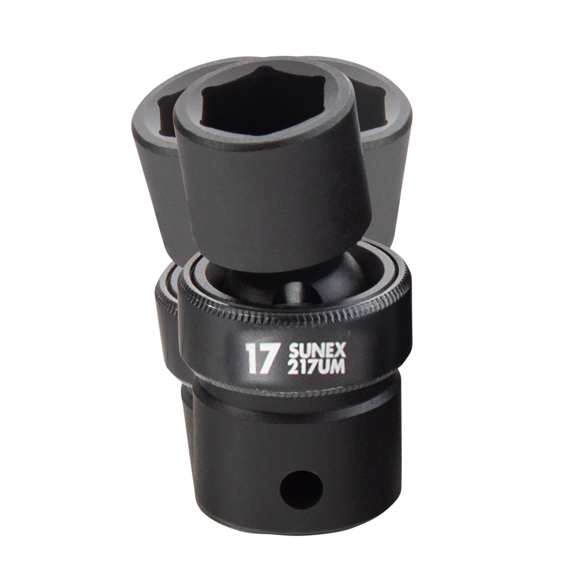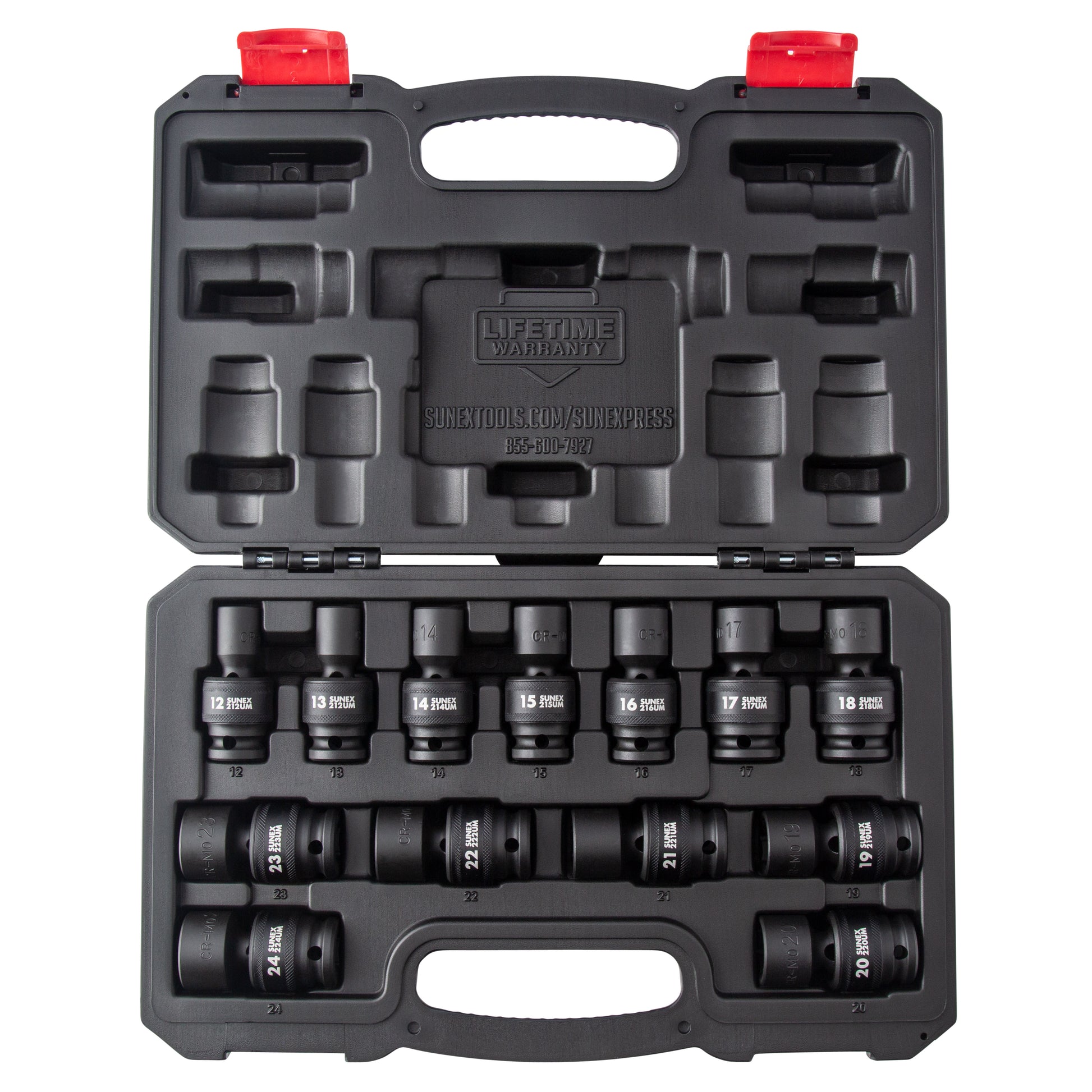 - The SUNEX Tools 1/2‑inch Drive Metric 6‑Point Standard Universal 13‑Piece Impact Socket Set is built for pro shops that need strength, access, and full coverage in one kit. Forged from tough CR‑MO alloy steel with a black phosphate finish, each socket resists corrosion while standing up to repeated impact use. The universal design rotates 360° and lets you angle tools about 30°, making hard‑to‑reach fasteners easier to attack without sacrificing torque. A radius‑corner profile boosts fastener engagement, reduces wear, and helps prevent rounding under heavy load. You get complete metric coverage from 12 mm through 24 mm with no skips, so the exact size you need is always on hand. Dual markings—laser‑etched and permanently stamped—ensure quick size identification even in dim workspaces. The set ships in a heavy‑duty case for organized storage and transport. Backed by SUNEX’s lifetime warranty and designed to meet or exceed ANSI and ASME standards, this kit delivers dependable, long‑lasting performance for automotive, industrial, and maintenance tasks.