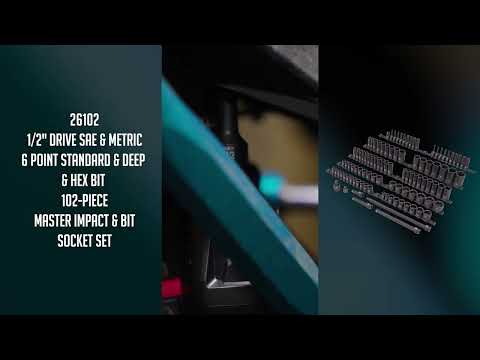 - The 102-Piece Master Impact & Bit Socket Set provides everything you need for precise and efficient fastening tasks. This comprehensive set features 1/2” drive standard and deep sockets (9–30mm, 3/8"–1-1/2"), long hex bit sockets (9–19mm, 1/4"–3/4"), universal joints, extensions, and adapters. Made from high-quality CR-MO alloy steel, these sockets deliver exceptional strength, impact resistance, and durability, perfect for tough jobs in professional and industrial environments. The radius corner design improves fastener engagement and reduces wear on both the tool and fasteners, extending their lifespan. Dual size markings provide easy and accurate identification, even in low-light conditions. The universal joint allows for 360° rotation and up to a 30° angle of flexibility, making it easier to reach hard-to-access fasteners. The adjustable socket rails keep the set organized and offer secure storage for sockets of varying sizes. The black phosphate finish provides superior corrosion resistance, protecting the set from rust and wear. Backed by a lifetime warranty, this set offers peace of mind and long-term reliability, meeting ANSI and ASME standards for safe and dependable use.