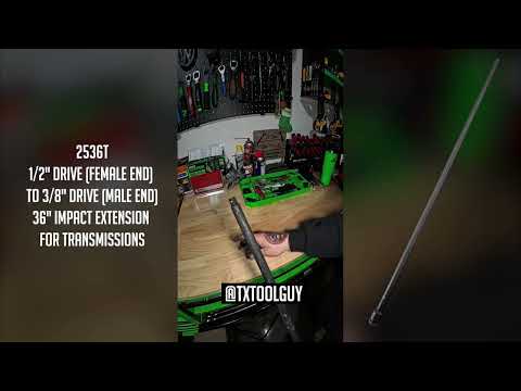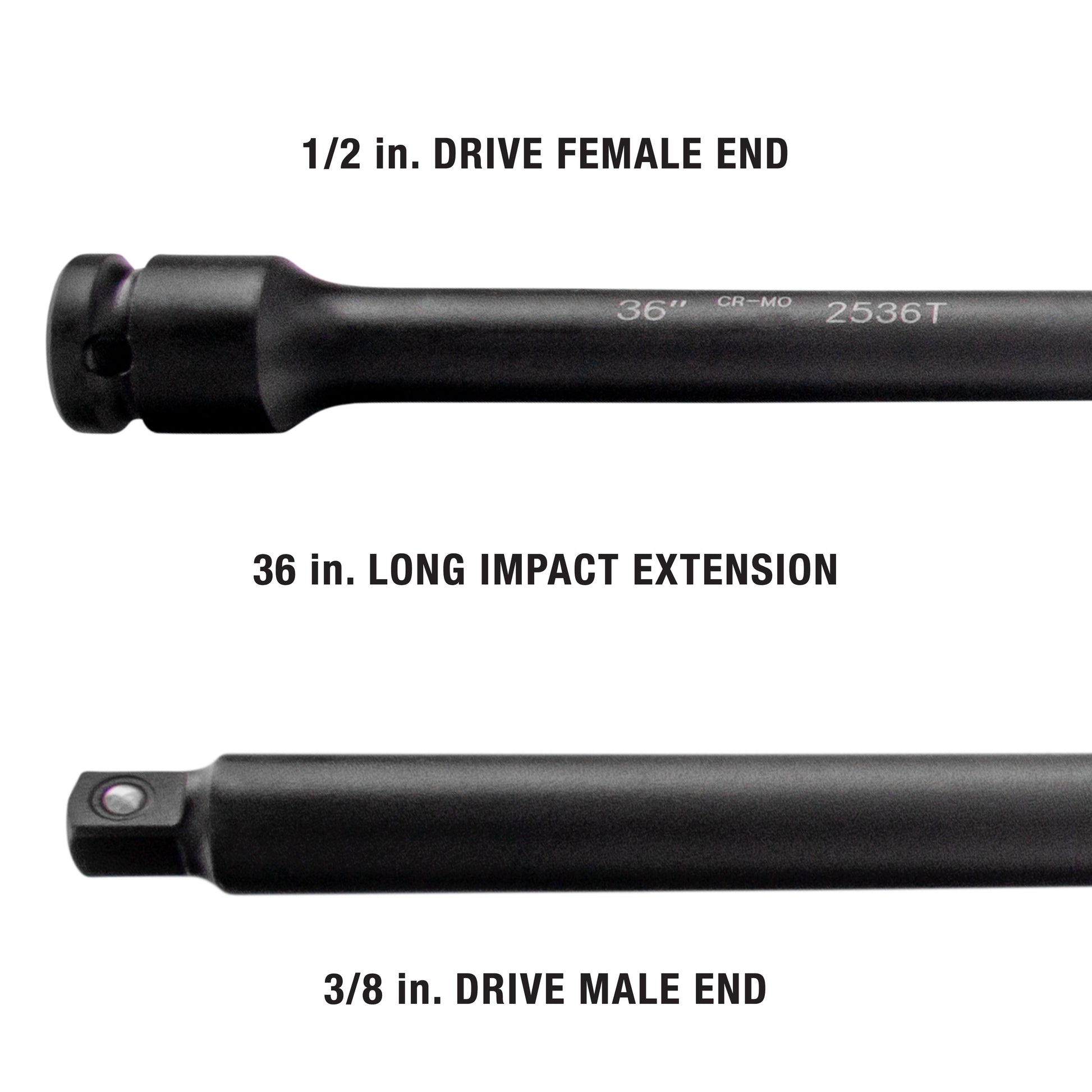 - SUNEX Tool 1/2" Drive (Female) to 3/8" Drive (Male) 36" Impact Extension for Transmissions is built to tackle hard-to-reach fasteners with the 1/2" Drive (Female End) to 3/8" Drive (Male End) 36" Impact Extension—purpose-built to simplify transmission removals and other deep access applications. This extra-long extension delivers the reach and leverage needed to access bolts buried behind cross members, frames, and tight transmission housings where standard tools can’t fit. Engineered for impact performance, it’s forged from premium CR-MO (chrome molybdenum) alloy steel for exceptional strength, durability, and resistance to high torque. A protective black phosphate finish shields against corrosion and wear, extending tool life in demanding shop environments. The 1/2" female drive end pairs perfectly with impact wrenches or ratchets, while the 3/8" male drive end accepts sockets and universal joints for versatile use. Meeting or exceeding ANSI and ASME standards, this heavy-duty extension ensures reliable performance and technician safety on every job. Backed by a full lifetime warranty with no exclusions on impact tools, it delivers lasting confidence in your toolbox. Get the access, strength, and reliability you need for tough transmission work with this 36" impact extension.