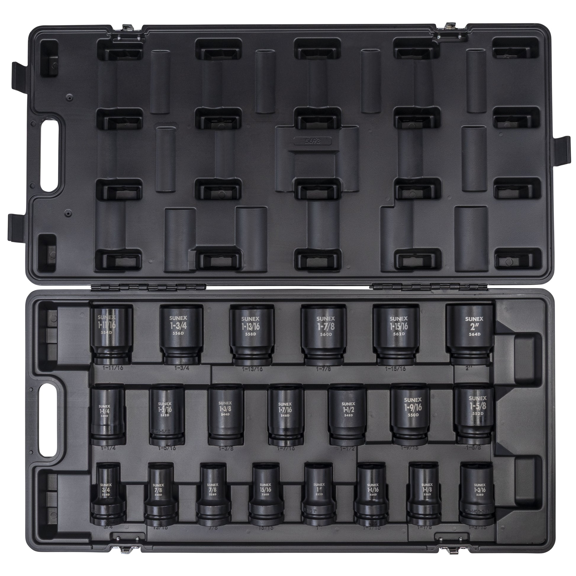 - The SUNEX Tools 5693 1" Drive SAE 6 Point Deep 21-Piece Impact Socket Set is built for power, durability, and reliability on the toughest jobs. Forged from premium CR-MO alloy steel, these impact sockets deliver maximum strength and long-lasting performance under heavy torque applications. The radius corner design increases fastener engagement while reducing wear, ensuring a secure grip that protects both the socket and the fastener.