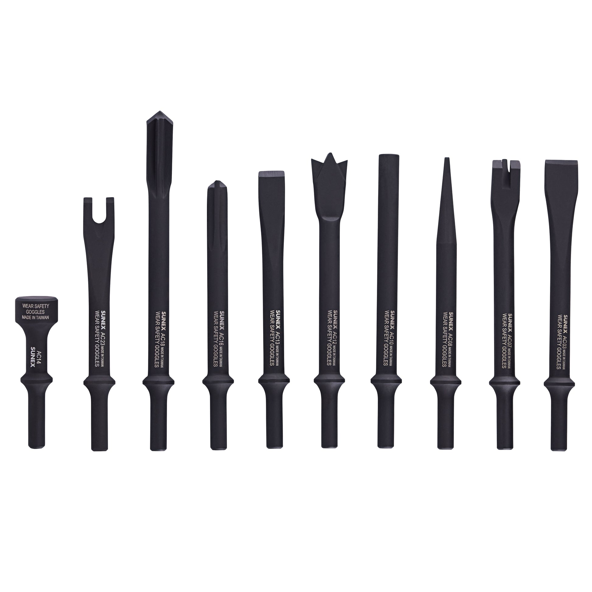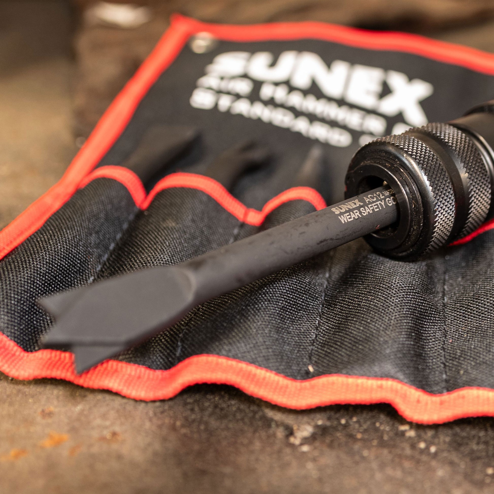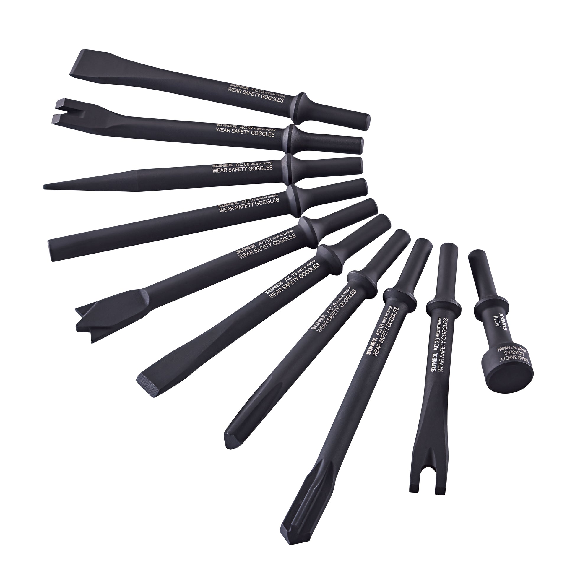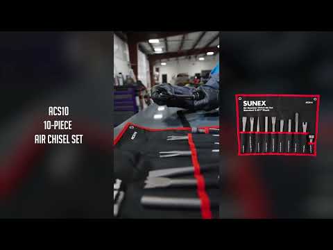 - The SUNEX ACS10 Standard 10-Piece Air Hammer Chisel Set delivers professional-grade performance with innovative durability features. Designed with a patented chamfer edge, each chisel offers up to 50% longer life by reducing wear on your air hammer's retainer. Constructed from enhanced, wear-resistant material, these chisels are built to withstand tough jobs in automotive, industrial, and fabrication environments. The set includes a wide variety of tools—muffler butter, nut splitter, panel cutters, punches, flat chisel, and more—providing maximum versatility for cutting, splitting, and shaping tasks. All chisels feature a standard .401 shank size for broad compatibility and are finished in black oxide to protect against rust and corrosion. A heavy-duty 600D polyester tool roll with a water-repellent coating and hook-and-loop closure keeps your tools organized and portable. Whether you're in a shop or on the go, this comprehensive chisel kit is built for power, precision, and long-term use. Dimensions: Unrolled – 12" x 16.1", Rolled – 3.9" x 8.6". Includes: (10) Air Hammer Chisels – 3-1/2" hammer, 6" nut splitter, 8” muffler cutter, 6-1/2" bushing splitter, 6-1/2" rivet cutter, 7” dual blade panel cutter, straight punch, tapered punch, claw ripper & panel cutter, flat chisel; (1) custom 600D polyester roll pouch.