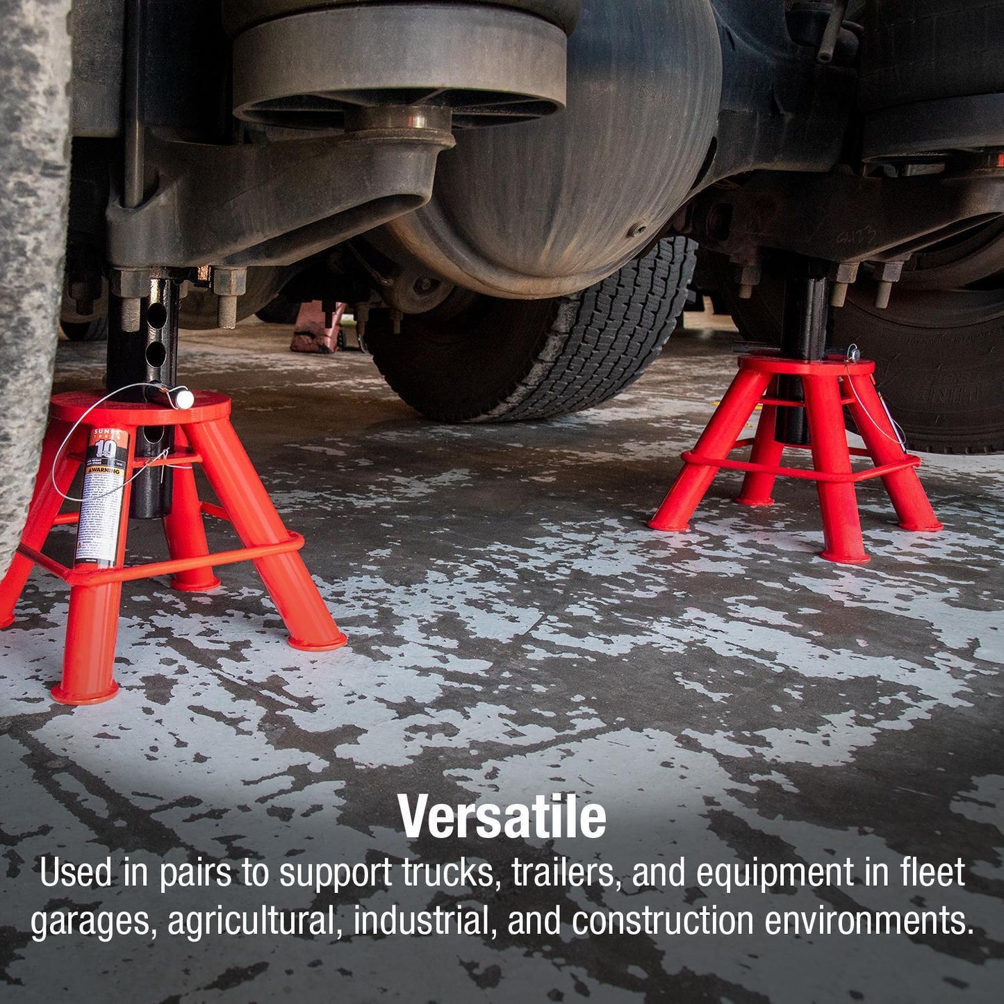 - Used in pairs for supporting trucks, trailers, and equipment in fleet garages, agricultural, industrial, and construction environments.
