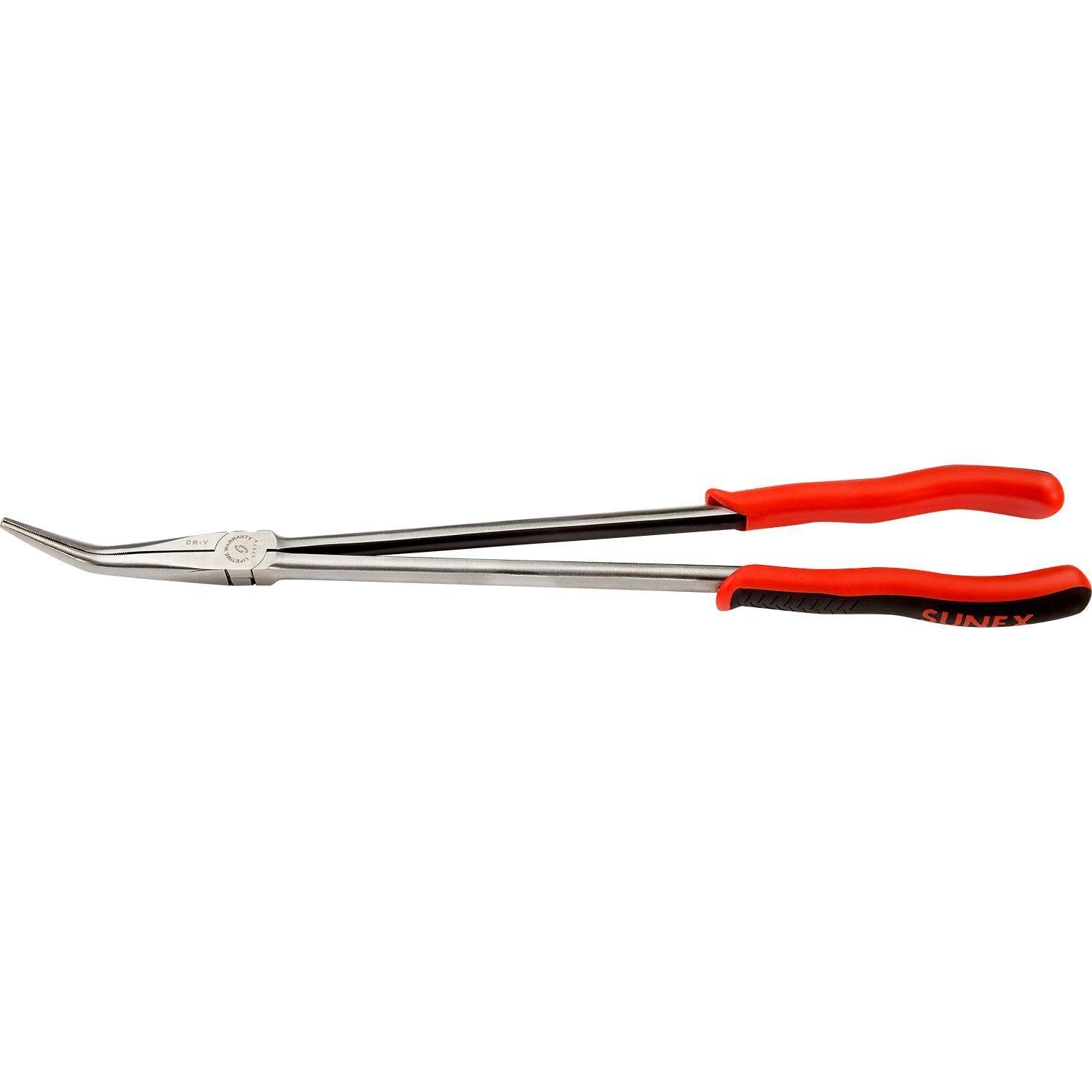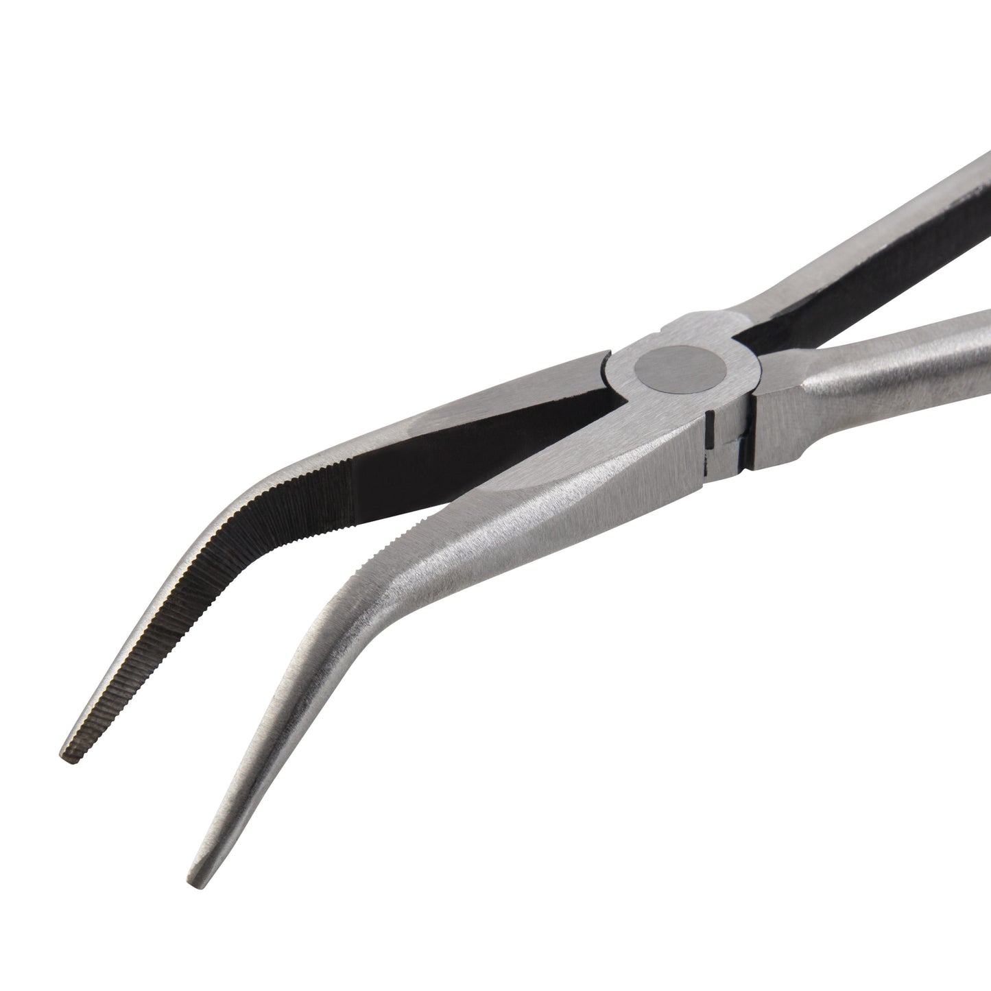 - The 16" Long Reach 45-Degree Bent Nose Pliers are designed for professionals who need precision and durability in tight spaces. Featuring forged steel jaws, these pliers provide maximum gripping power, ensuring long-lasting performance even in tough work environments. The 16" long reach offers superior accessibility, allowing users to tackle fasteners, clips, hoses, plugs, and sensors in areas where standard pliers cannot reach. The 45-degree bent nose provides enhanced precision for gripping small parts and bending wire effortlessly in confined spaces, making these pliers perfect for intricate tasks. Cross-hatched teeth ensure a firm grip and prevent slippage, giving users full control when working on delicate components. Ergonomic comfort grip handles reduce fatigue, allowing for prolonged use without strain. Constructed from high-quality Cr-V steel, these pliers resist rust and wear, ensuring superior strength and corrosion resistance. Whether you're working in automotive, HVAC, or industrial applications, these pliers are a versatile tool that delivers reliable performance. Engineered with professionals in mind, the precision-engineered design ensures that mechanics and technicians can complete jobs efficiently with minimal effort. Upgrade your toolbox with the 16" Long Reach 45-Degree Bent Nose Pliers and tackle any job with confidence.