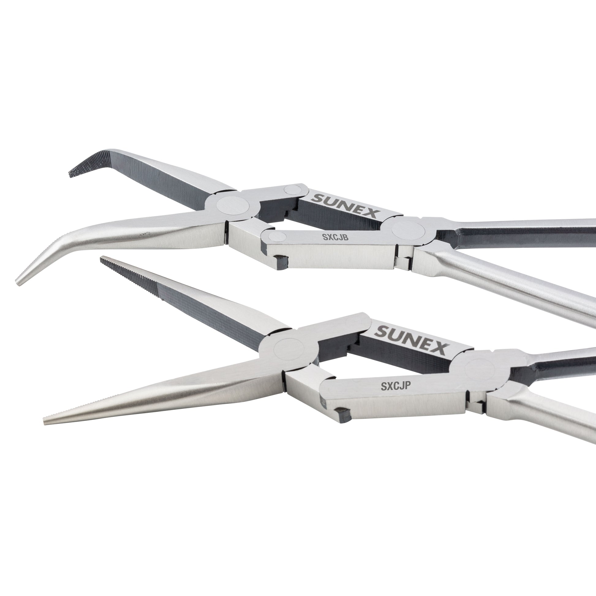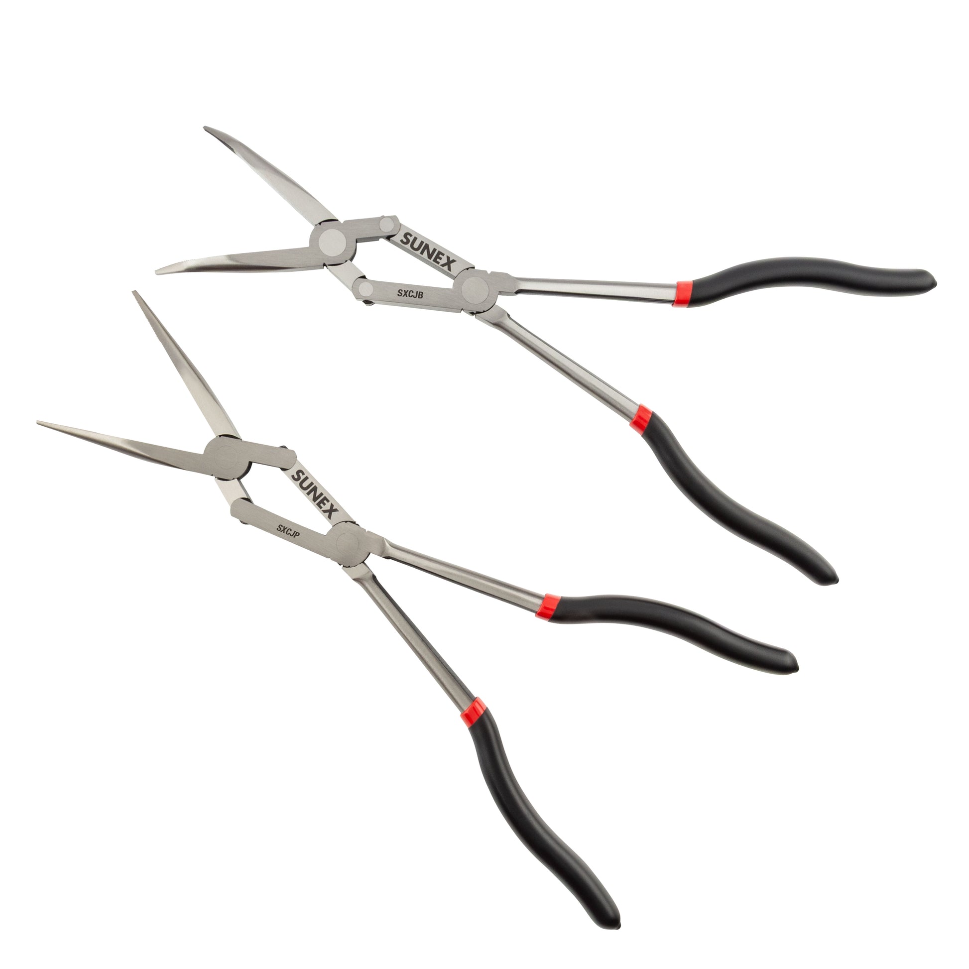 - The SUNEX Dual-Joint Extended Reach Pliers Set is designed for professionals who need superior access and precision in tight spaces. Featuring a dual-joint extended reach design, these pliers offer jaws that open to 2" wide with 50% less handle movement, providing exceptional control in confined areas without compromising performance. The set includes straight and 45° bent nose pliers, ideal for precision tasks in hard-to-reach spots, such as automotive repair or mechanical work. The flush rivet construction ensures a narrow profile, maintaining strength while allowing seamless access in restricted areas. Equipped with serrated jaws, these pliers deliver a secure grip, enhancing control during intricate work. Crafted from durable alloy steel, they’re built to withstand demanding applications and harsh environments, with rust resistance for long-lasting reliability. The ergonomic, double-dipped grips offer a comfortable, secure hold, reducing hand fatigue during extended use. Perfect for gripping, bending, and handling small components, these versatile pliers are ideal for automotive, mechanical, and general repair tasks where extra reach is essential. Elevate your tool collection with the SUNEX Dual-Joint Extended Reach Pliers Set for precision and durability.