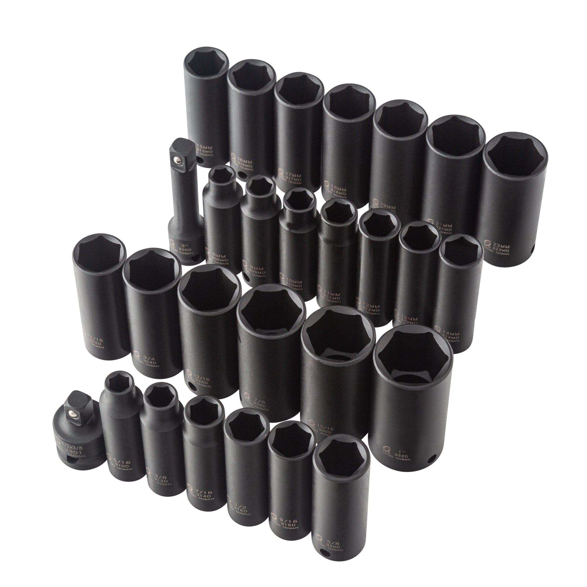 - 1/2" drive 1/2" female x 3/8" male super impact adapter, 3/8" drive 8mm deep impact socket, 3/8" drive 9mm deep impact socket, 3/8" drive 5/16" deep impact socket, 3/8" drive 10mm deep impact socket, 3/8" drive 11mm deep impact socket, 3/8" drive 3/8" deep impact socket, 3/8" drive 12mm deep impact socket, 3/8" drive 13mm deep impact socket, 3/8" drive 7/16" deep impact socket, 3/8" drive 14mm deep impact socket, 3/8" drive 15mm deep impact socket, 3/8" drive 1/2" deep impact socket, 3/8" drive 16mm deep impact socket, 3/8" drive 17mm deep impact socket, 3/8" drive 9/16" deep impact socket, 3/8" drive 18mm deep impact socket, 3/8" drive 19mm deep impact socket, 3/8" drive 5/8" deep impact socket, 3/8" drive 21mm deep impact socket, 3/8" drive 11/16" deep impact socket, 3/8" drive 22mm deep impact socket, 3/8" drive 3/4" deep impact socket, 3/8" drive 13/16" deep impact socket, 3/8" drive 7/8" deep impact socket, 3/8" drive 15/16" deep impact socket, 3/8" drive 1" deep impact socket, 3/8" drive 3" impact extension