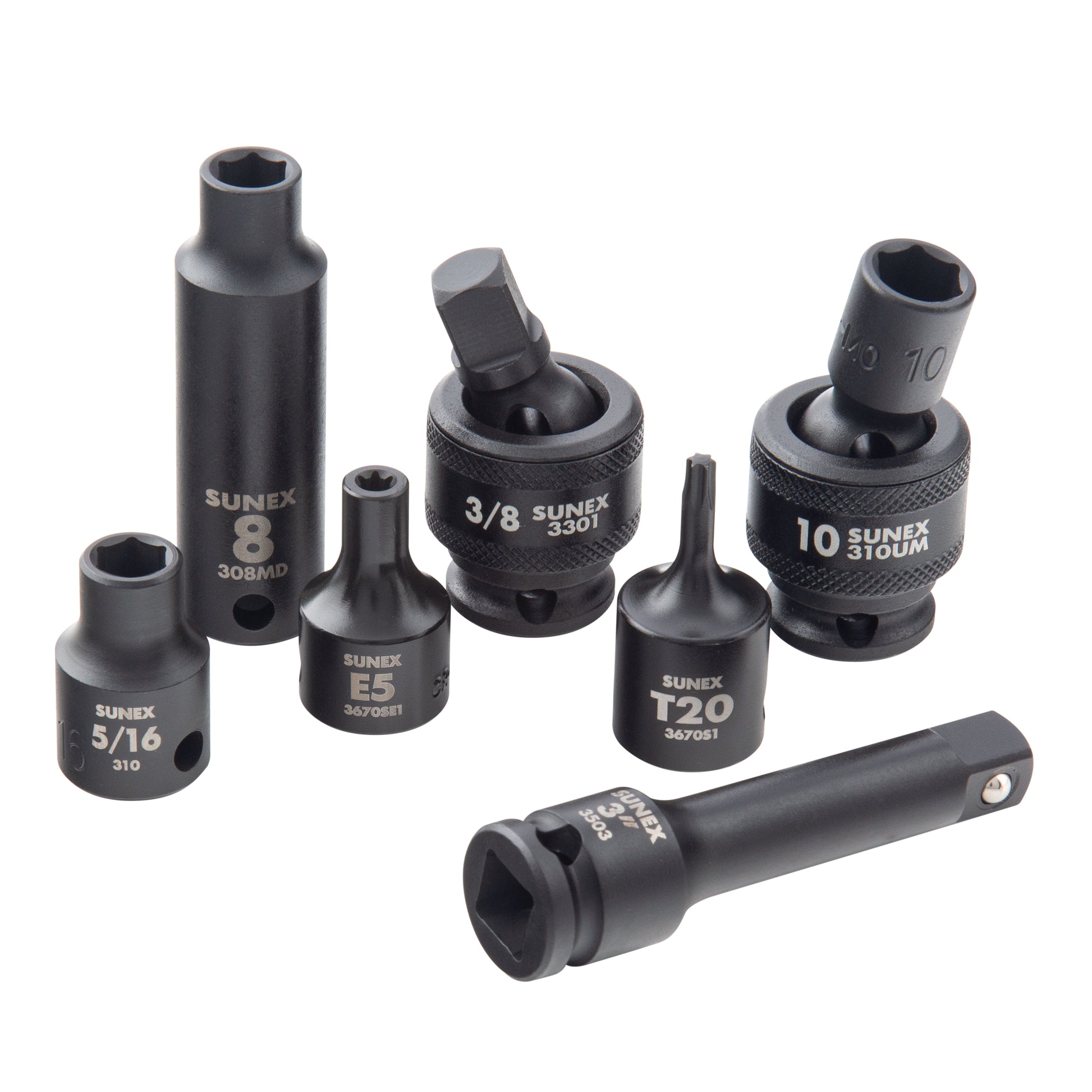 - 3/8" drive 8mm impact socket, 3/8" drive 8mm deep impact socket, 3/8" drive 9mm impact socket, 3/8" drive 9mm deep impact socket, 3/8" drive 5/16" impact socket, 3/8" drive 5/16" deep impact socket, 3/8" drive 10mm impact socket, 3/8" drive 10mm deep impact socket, 3/8" drive 10mm universal impact socket, 3/8" drive 11mm impact socket, 3/8" drive 11mm deep impact socket, 3/8" drive 11mm universal impact socket, 3/8" drive 3/8" impact socket, 3/8" drive 3/8" deep impact socket, 3/8" drive 12mm impact socket, 3/8" drive 12mm deep impact socket, 3/8" drive 3/8" universal impact socket, 3/8" drive 12mm universal impact socket, 3/8" drive 13mm impact socket, 3/8" drive 13mm deep impact socket, 3/8" drive 13mm universal impact socket, 3/8" drive 7/16" impact socket, 3/8" drive 7/16" deep impact socket, 3/8" drive 14mm impact socket, 3/8" drive 14mm deep impact socket, 3/8" drive 7/16" universal impact socket, 3/8" drive 14mm universal impact socket, 3/8" drive 15mm impact socket, 3/8" drive 15mm deep impact socket, 3/8" drive 15mm universal impact socket, 3/8" drive 1/2" impact socket, 3/8" drive 1/2" deep impact socket, 3/8" drive 16mm impact socket, 3/8" drive 16mm deep impact socket, 3/8" drive 1/2" universal impact socket, 3/8" drive 16mm universal impact socket, 3/8" drive 17mm impact socket, 3/8" drive 17mm deep impact socket, 3/8" drive 17mm universal impact socket, 3/8" drive 9/16" impact socket, 3/8" drive 9/16" deep impact socket, 3/8" drive 18mm impact socket, 3/8" drive 18mm deep impact socket, 3/8" drive 9/16" universal impact socket, 3/8" drive 18mm universal impact socket, 3/8" drive 19mm impact socket, 3/8" drive 19mm deep impact socket, 3/8" drive 19mm universal impact socket, 3/8" drive 5/8" impact socket, 3/8" drive 5/8" deep impact socket