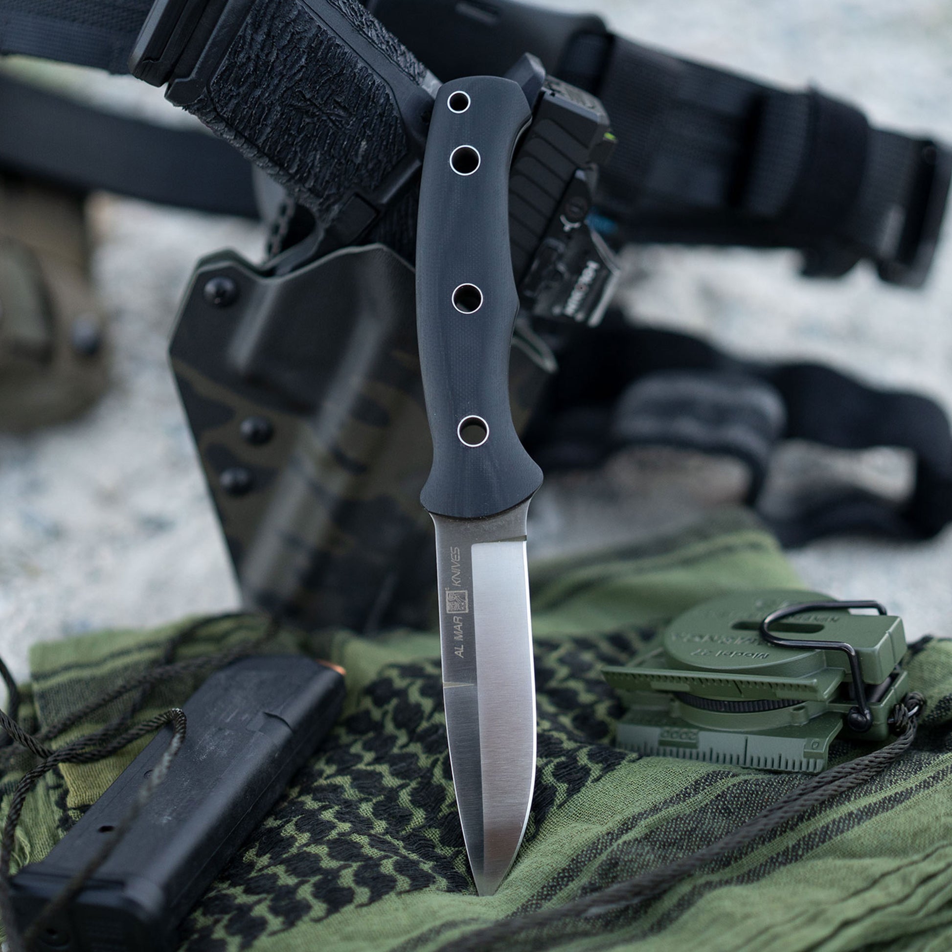 - Elevate Your Tactical Gear with Al Mar Knives Operator Series: 4" Ultimate Tactical Fixed Blade SERE Knife, Classic Al Mar Design with D2 Steel Blade. Explore the pinnacle of tactical excellence with our meticulously crafted Operator Series. This fixed-blade knife features a classic Al Mar design, boasting a formidable 4" talon-style blade meticulously crafted from rugged D2 steel. Equipped with a robust black G-10 handle at a thickness of 0.52" and an included composite sheath with adjustable pocket clip and integrated carbide sharpener, this knife ensures a secure grip and convenient carry. It's the perfect choice for military, police, camping, hiking, and survival use, offering the reliability and performance that professionals demand. Upgrade your tactical gear with Al Mar Knives' Operator Series. Whether you're a service member, outdoor enthusiast, or survivalist, this knife delivers unmatched style, precision, and durability, making it an ideal companion for all your high-demand tasks.