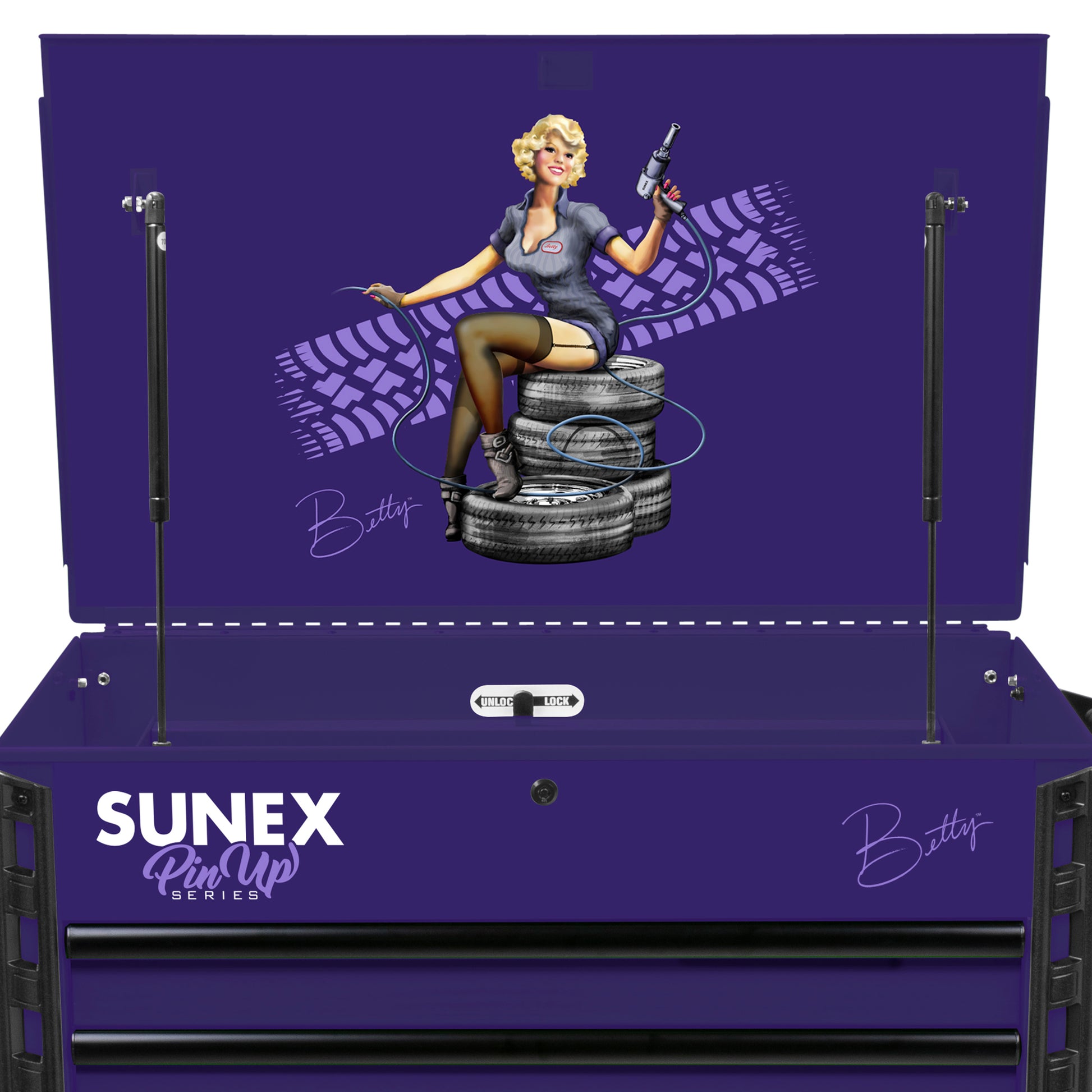 - Bring bold personality and professional performance to your workspace with the 8056FDBETTY Pin Up Series Service Cart features the exclusive Pin Up Plum “Betty” design, showcasing a smiling blonde pin‑up perched atop stacked tires in a retro mechanic shirt, skirt, stockings, and garter‑belt styling. Her long legs, pin‑up neckline, and the SUNEX impact wrench and deep socket in her hand complete the vintage look. A stylized tire‑tread backdrop adds depth and attitude, while her flowing cursive “Betty” signature gives the artwork a personalized, collectible finish that sets this cart apart.