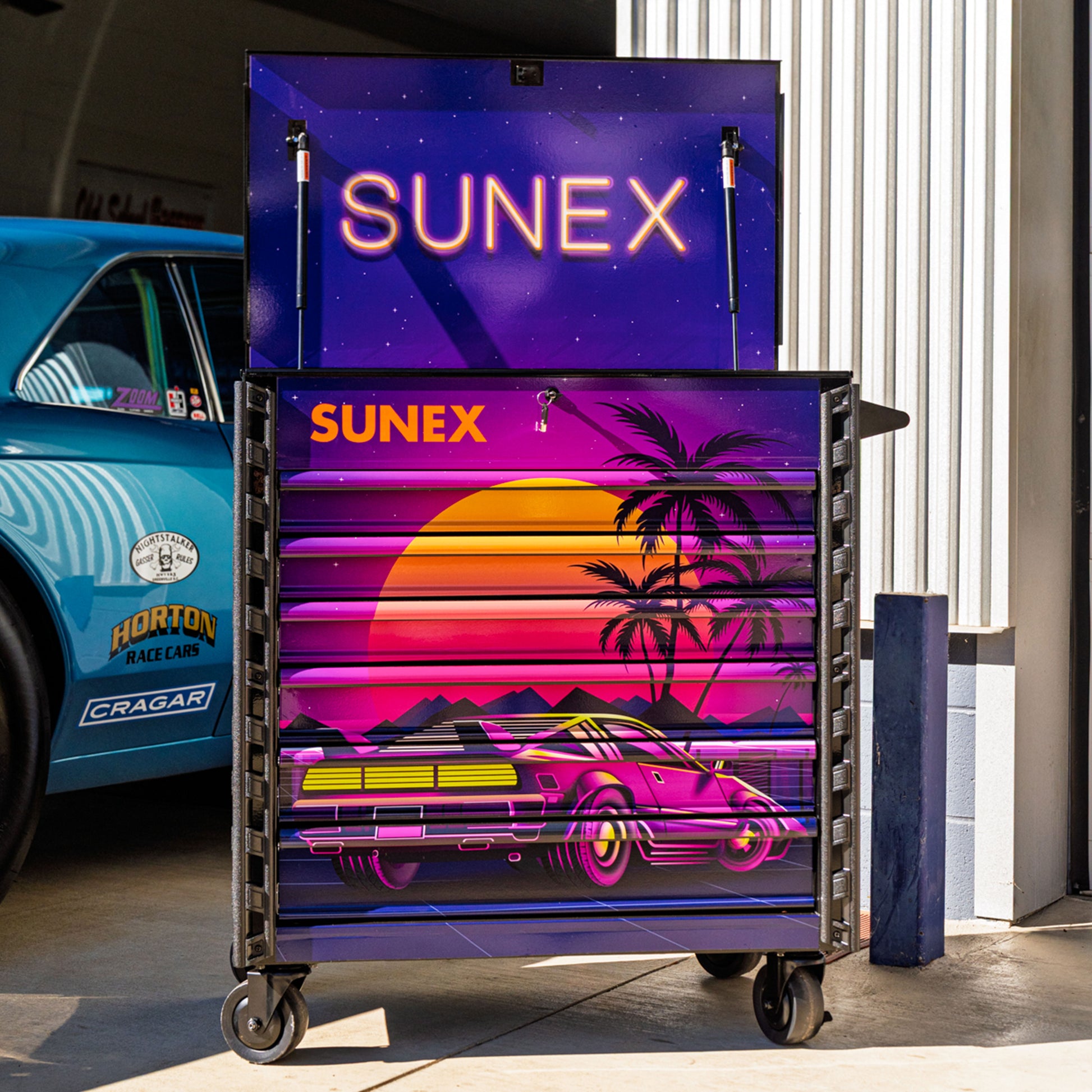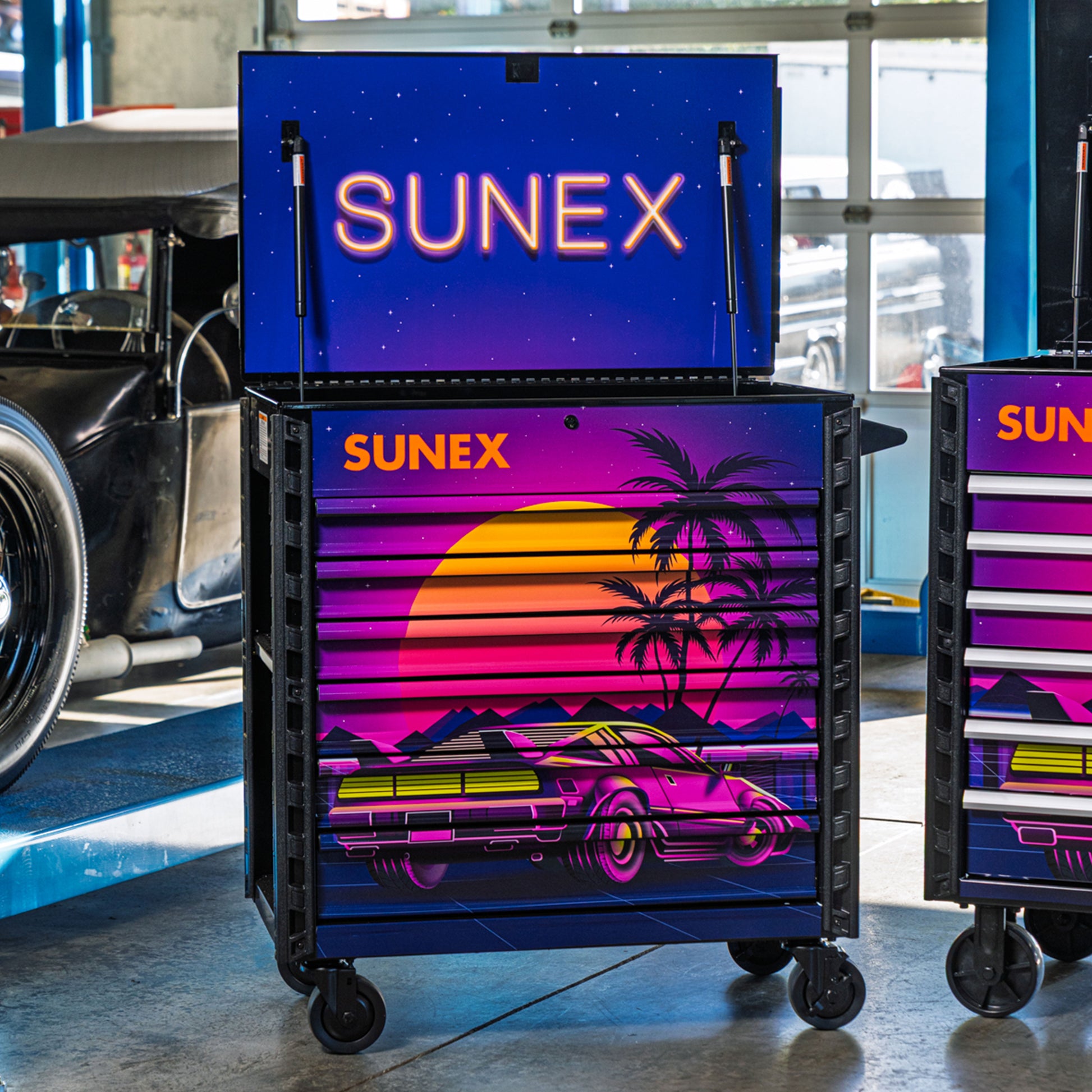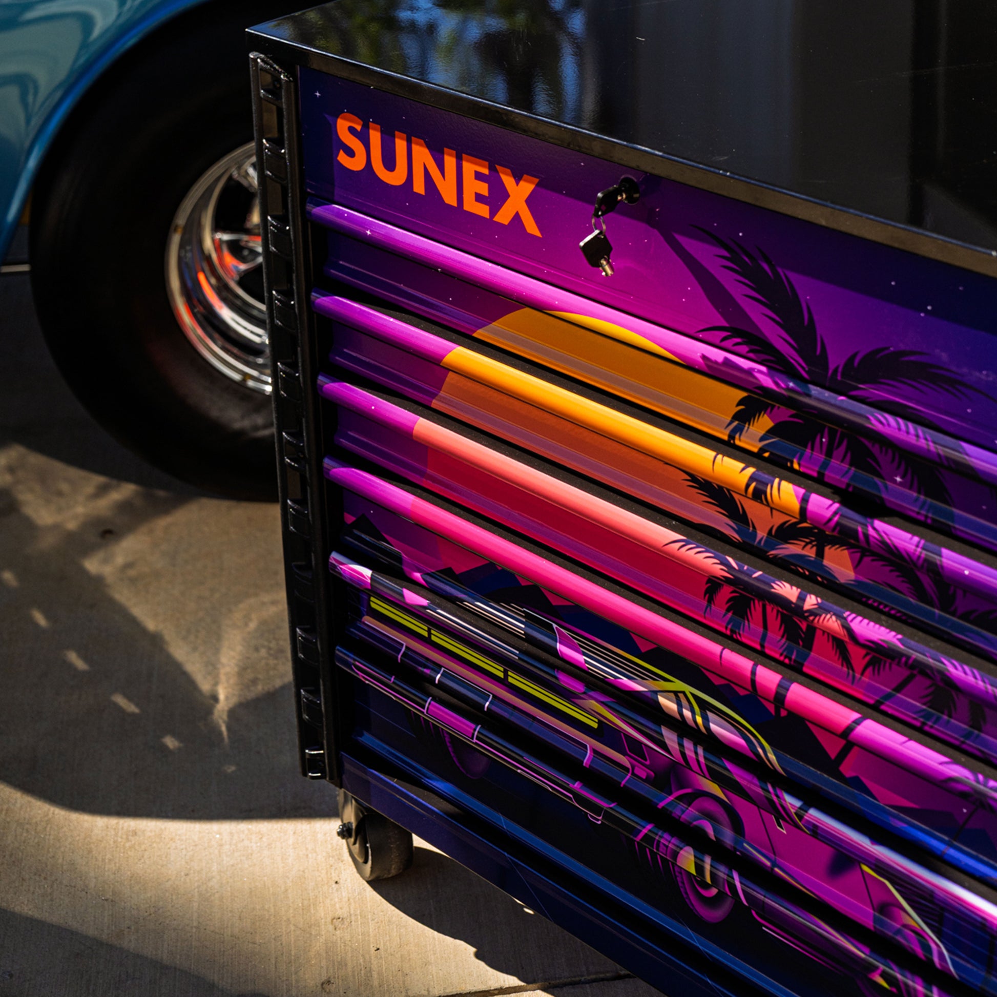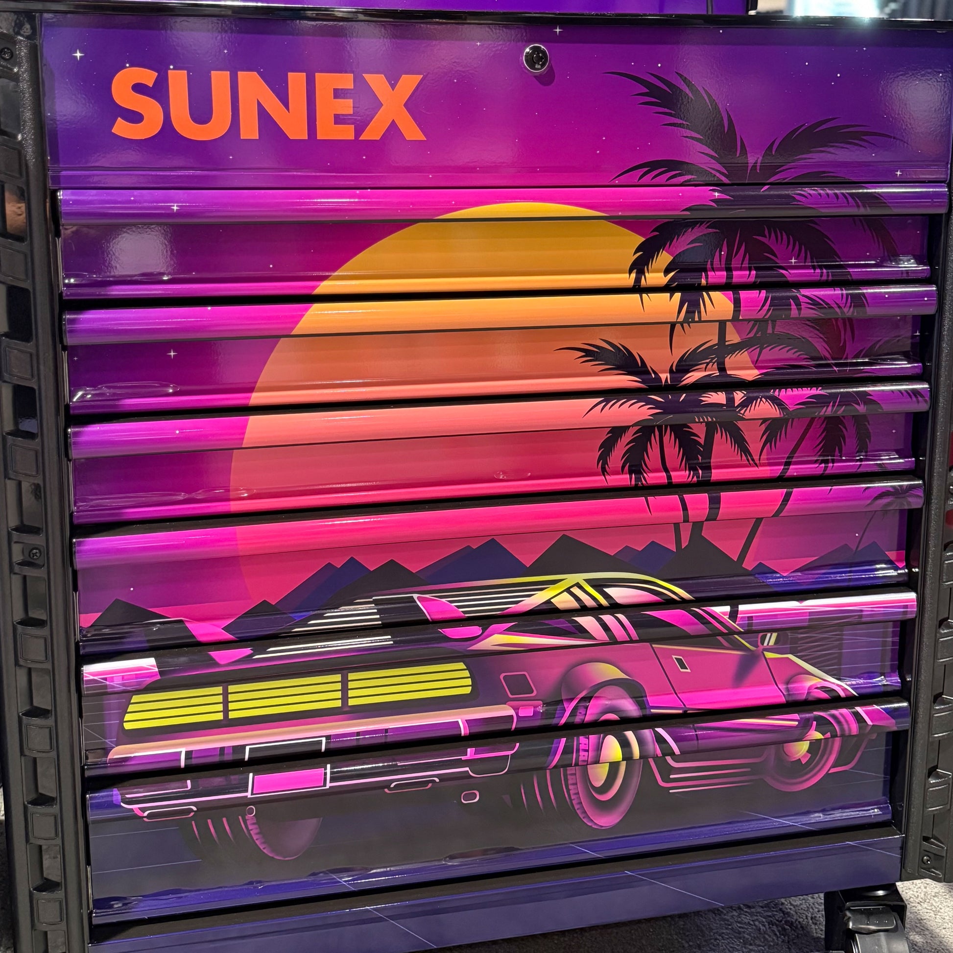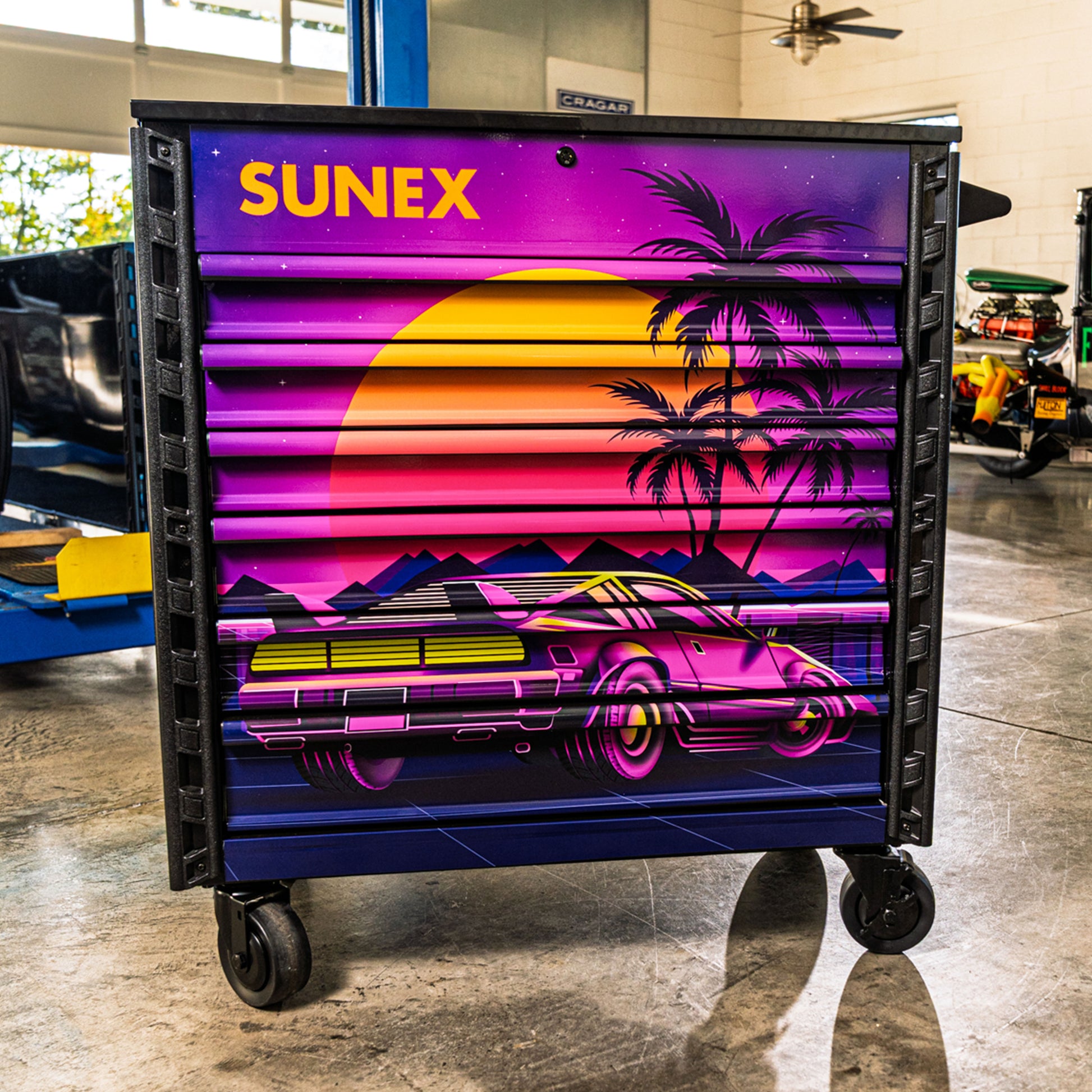 - The SUNEX Tools Premium Full Drawer Service Cart with Retro Graphics – 8057XTBKRETRO combines workshop performance with eye-catching 80s-inspired style. Built from heavy-duty 18-gauge (1.2mm) steel with a 600 lb capacity, this cart is engineered to handle demanding shop or garage environments while standing out with vibrant DeLorean, palm tree, and sunset-themed graphics in bold purple, orange, yellow, and pink hues. Designed for convenience and security, six barrel lock-secured drawers with premium latching handles protect your tools, while reinforced ball-bearing slides ensure smooth, full-extension access. A locking hinged lid with gas shocks allows for quick, effortless opening, and built-in pry bar and screwdriver holders keep essentials organized. Protective bumpers safeguard against accidental damage, and an industrial-grade powder-coated finish resists scratches and corrosion. For mobility, the cart features four swivel casters (two locking) and an adjustable side-mount handle for customizable maneuvering. Measuring 39.35” W x 21.5” D x 39.25” H, it offers versatile drawer depths for all tool sizes. Blending durable functionality with nostalgic design, the 8057XTBKRETRO is more than just a service cart—it’s a statement piece for technicians who demand performance with personality.