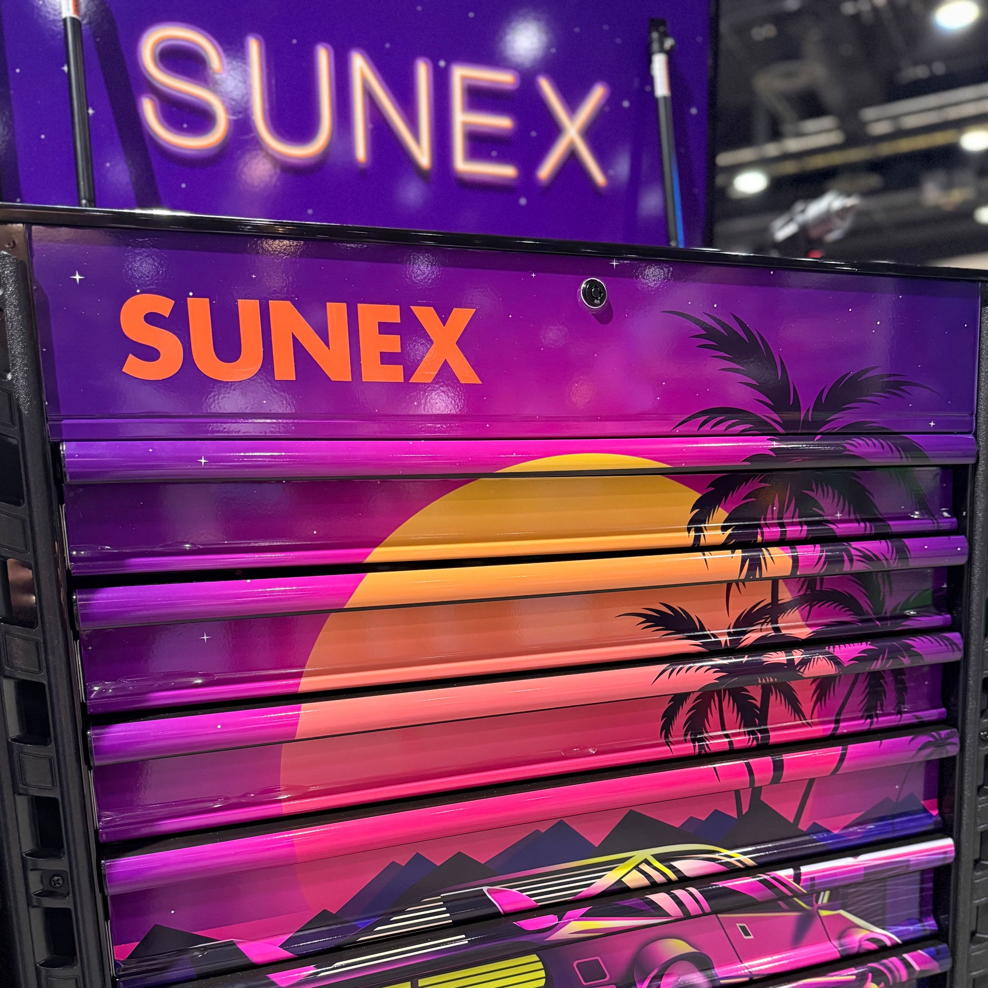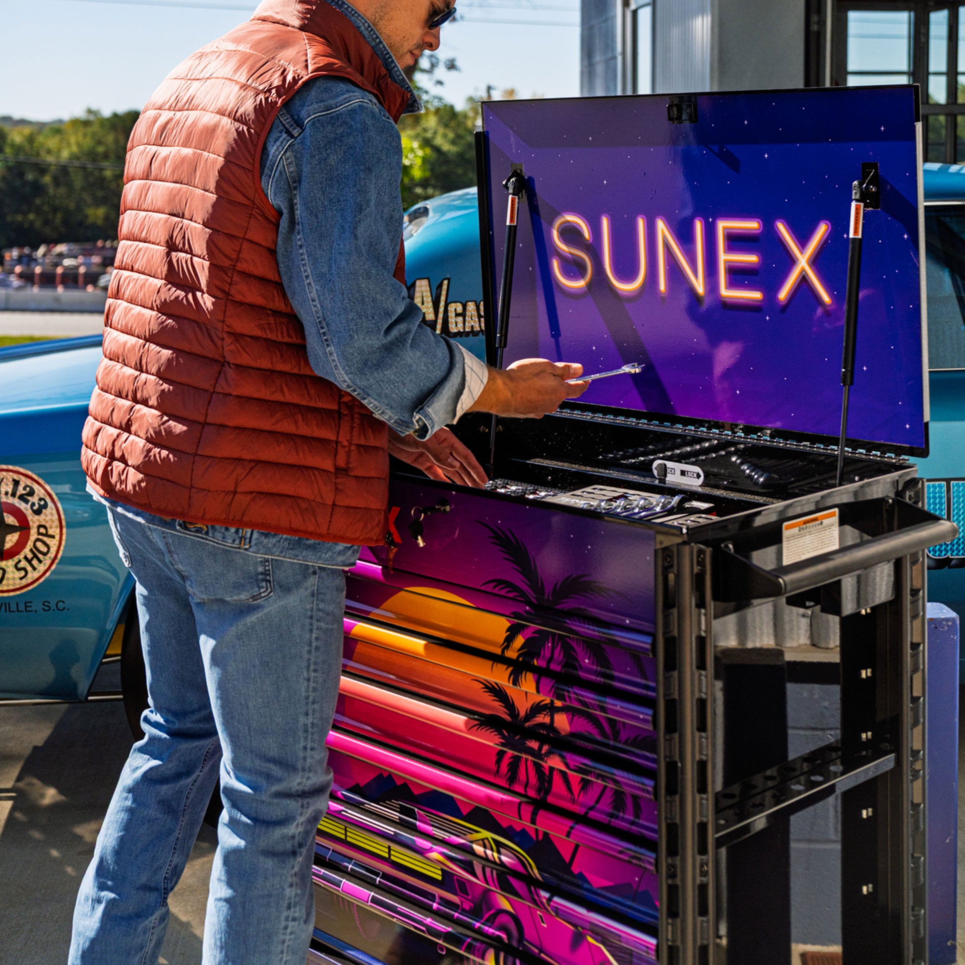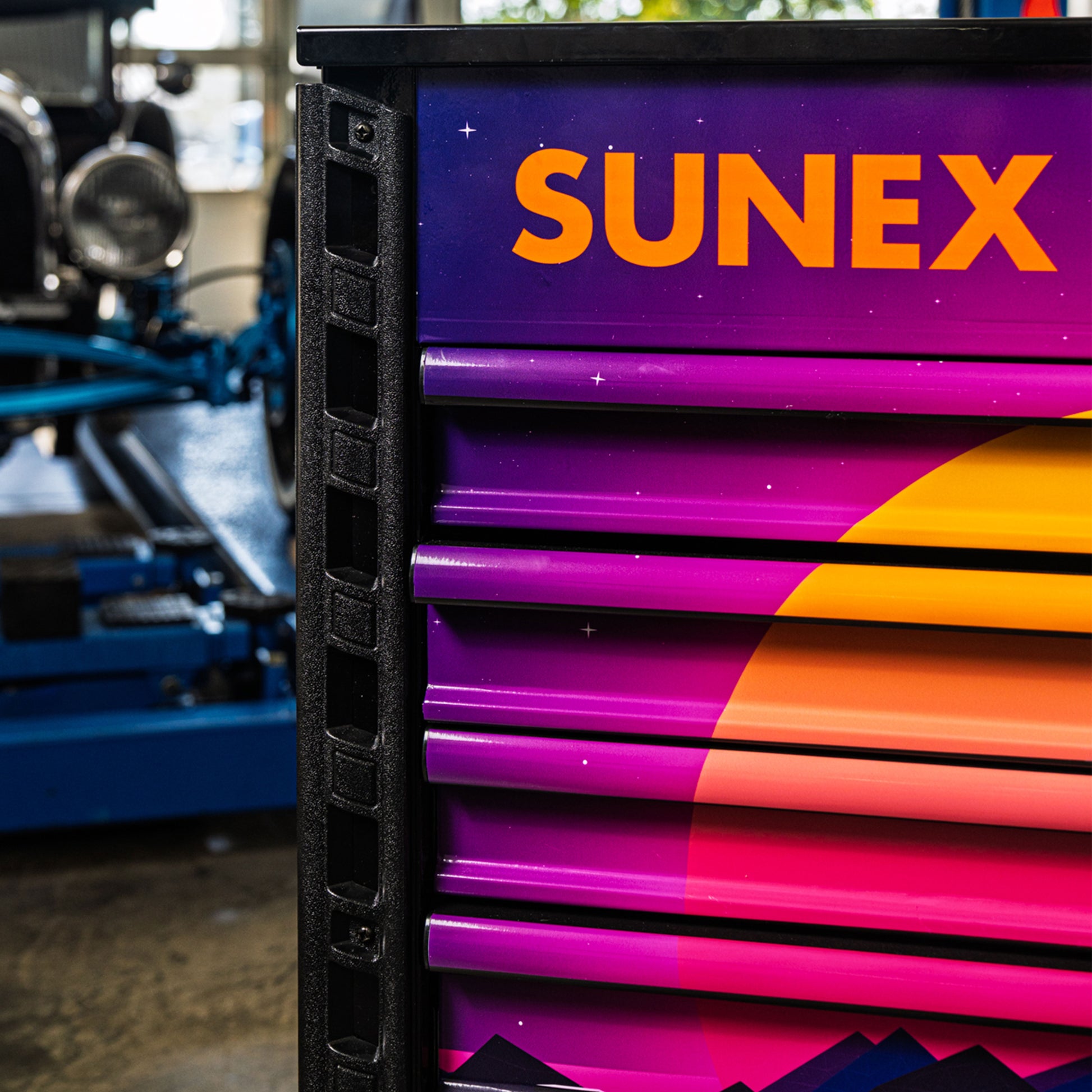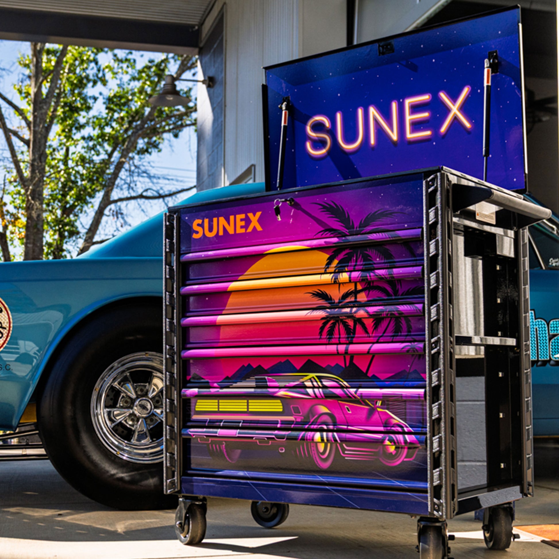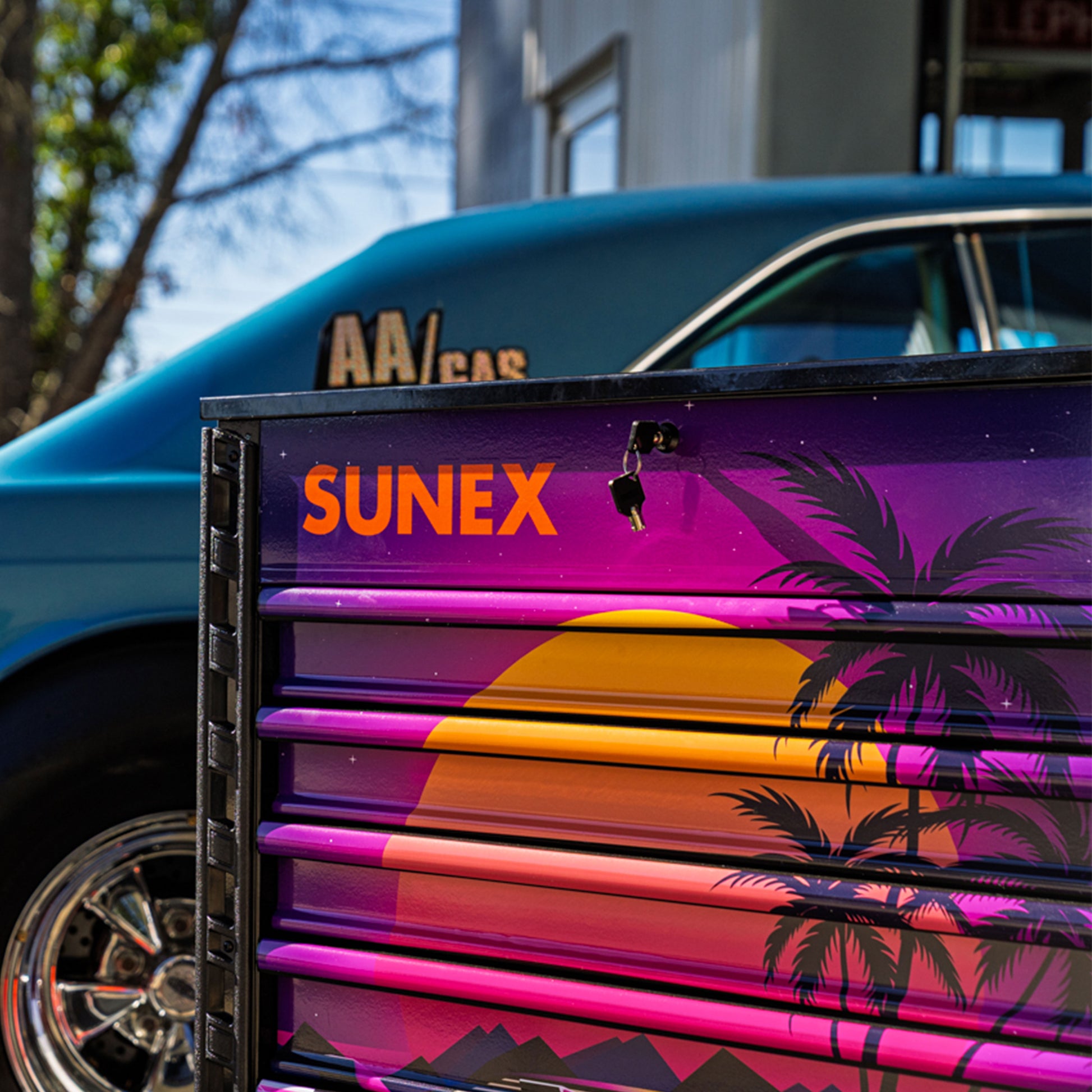 - The SUNEX Tools Premium Full Drawer Service Cart with Retro Graphics – 8057XTBKRETRO combines workshop performance with eye-catching 80s-inspired style. Built from heavy-duty 18-gauge (1.2mm) steel with a 600 lb capacity, this cart is engineered to handle demanding shop or garage environments while standing out with vibrant DeLorean, palm tree, and sunset-themed graphics in bold purple, orange, yellow, and pink hues. Designed for convenience and security, six barrel lock-secured drawers with premium latching handles protect your tools, while reinforced ball-bearing slides ensure smooth, full-extension access. A locking hinged lid with gas shocks allows for quick, effortless opening, and built-in pry bar and screwdriver holders keep essentials organized. Protective bumpers safeguard against accidental damage, and an industrial-grade powder-coated finish resists scratches and corrosion. For mobility, the cart features four swivel casters (two locking) and an adjustable side-mount handle for customizable maneuvering. Measuring 39.35” W x 21.5” D x 39.25” H, it offers versatile drawer depths for all tool sizes. Blending durable functionality with nostalgic design, the 8057XTBKRETRO is more than just a service cart—it’s a statement piece for technicians who demand performance with personality.