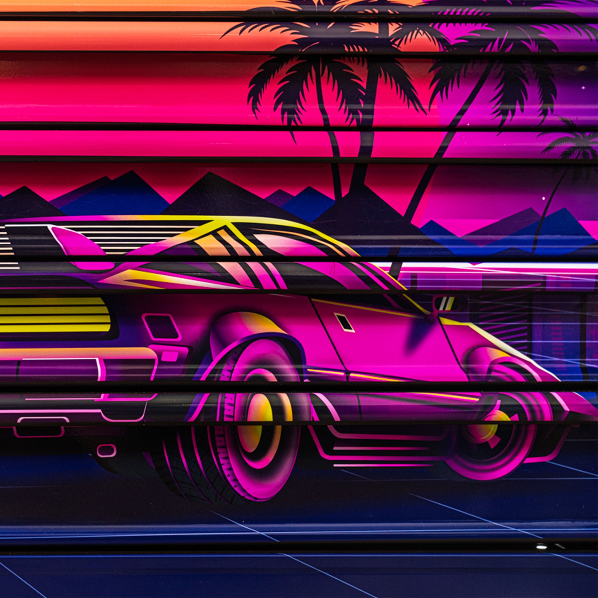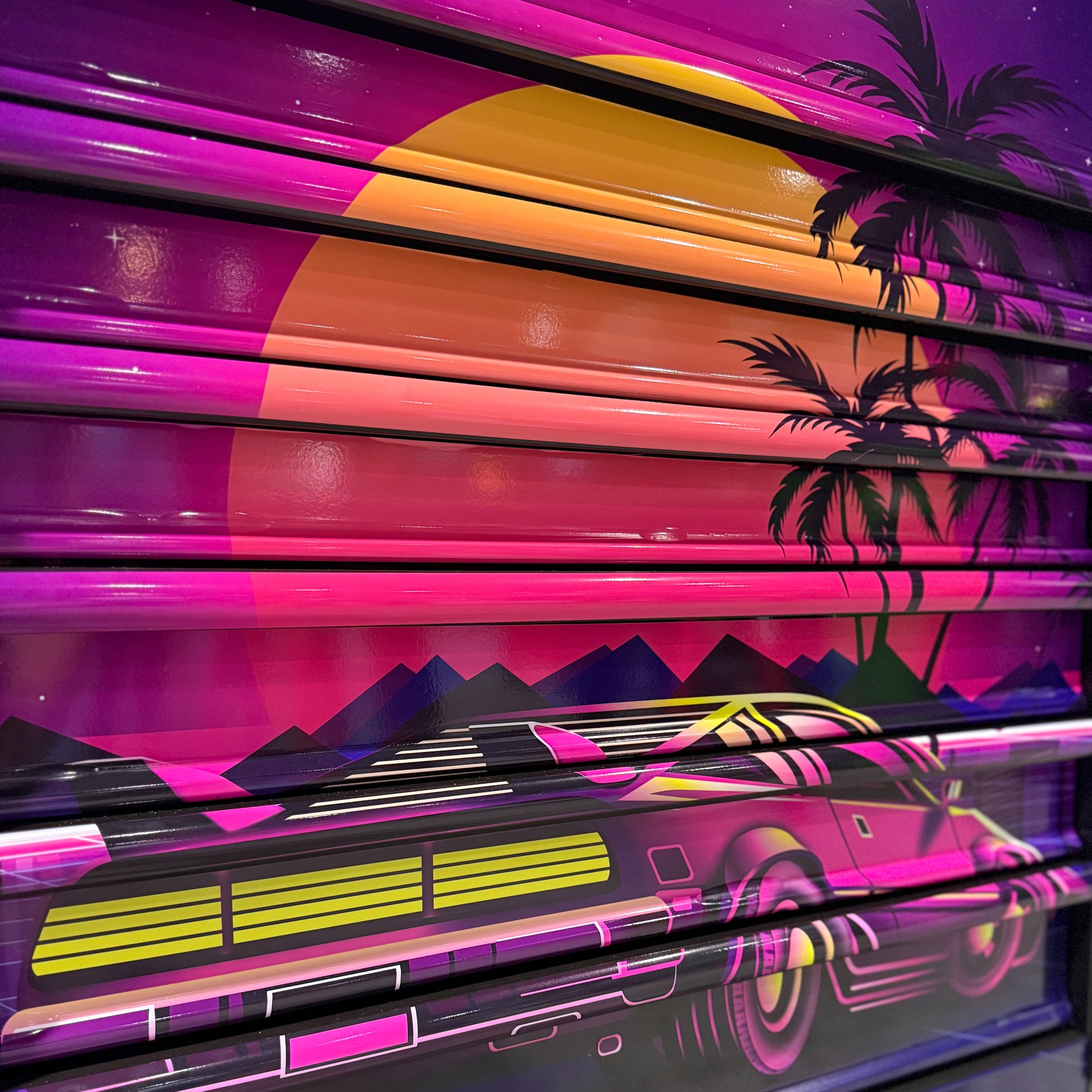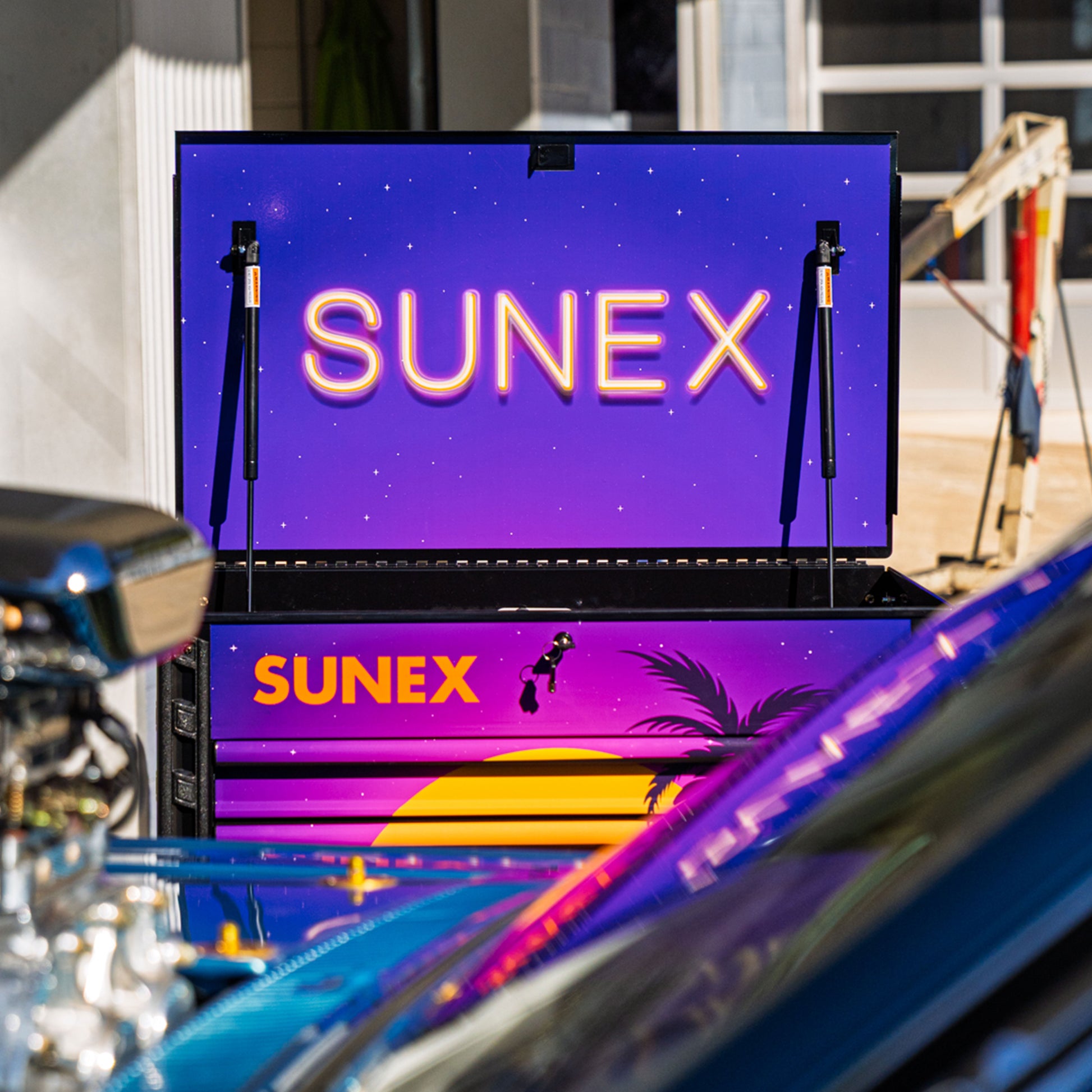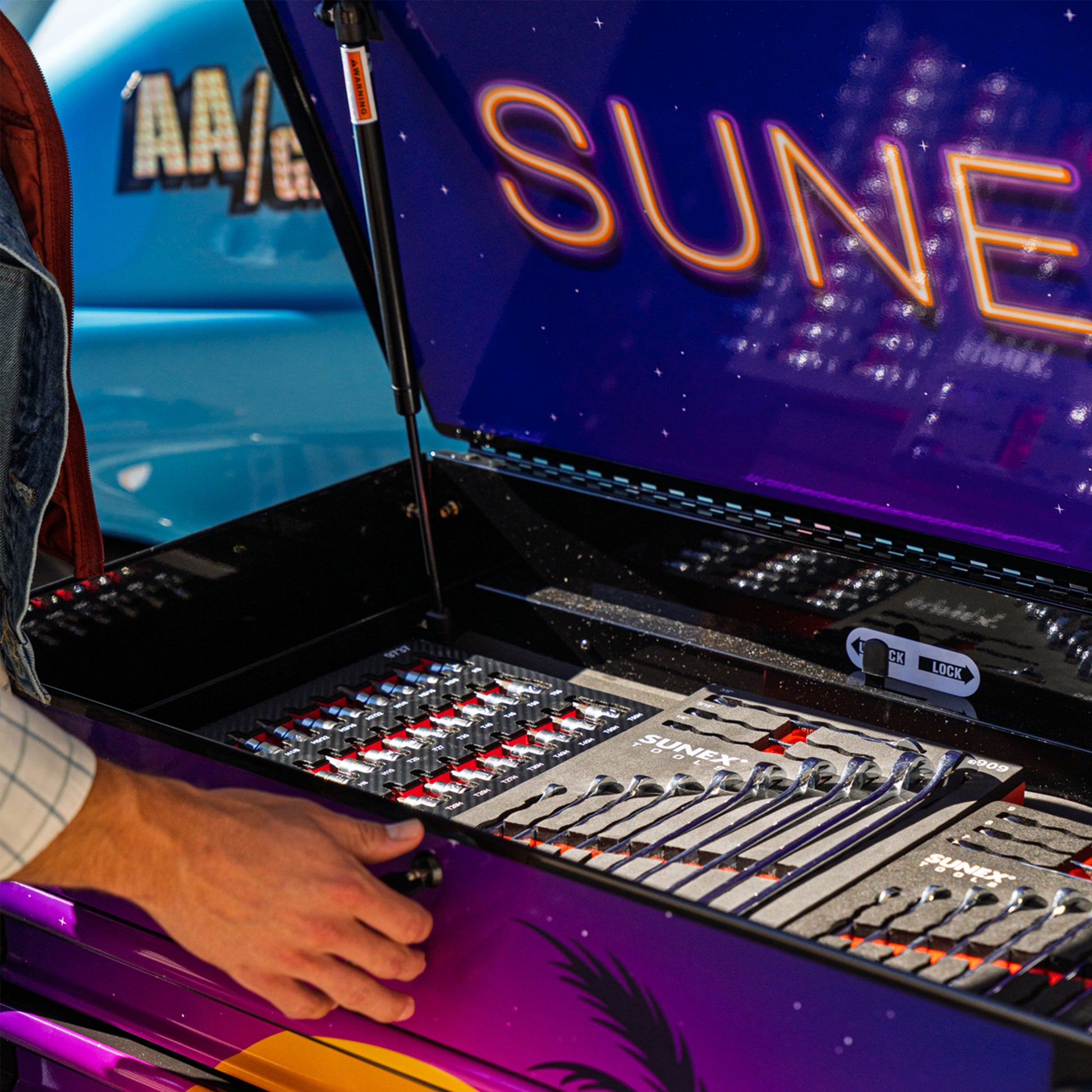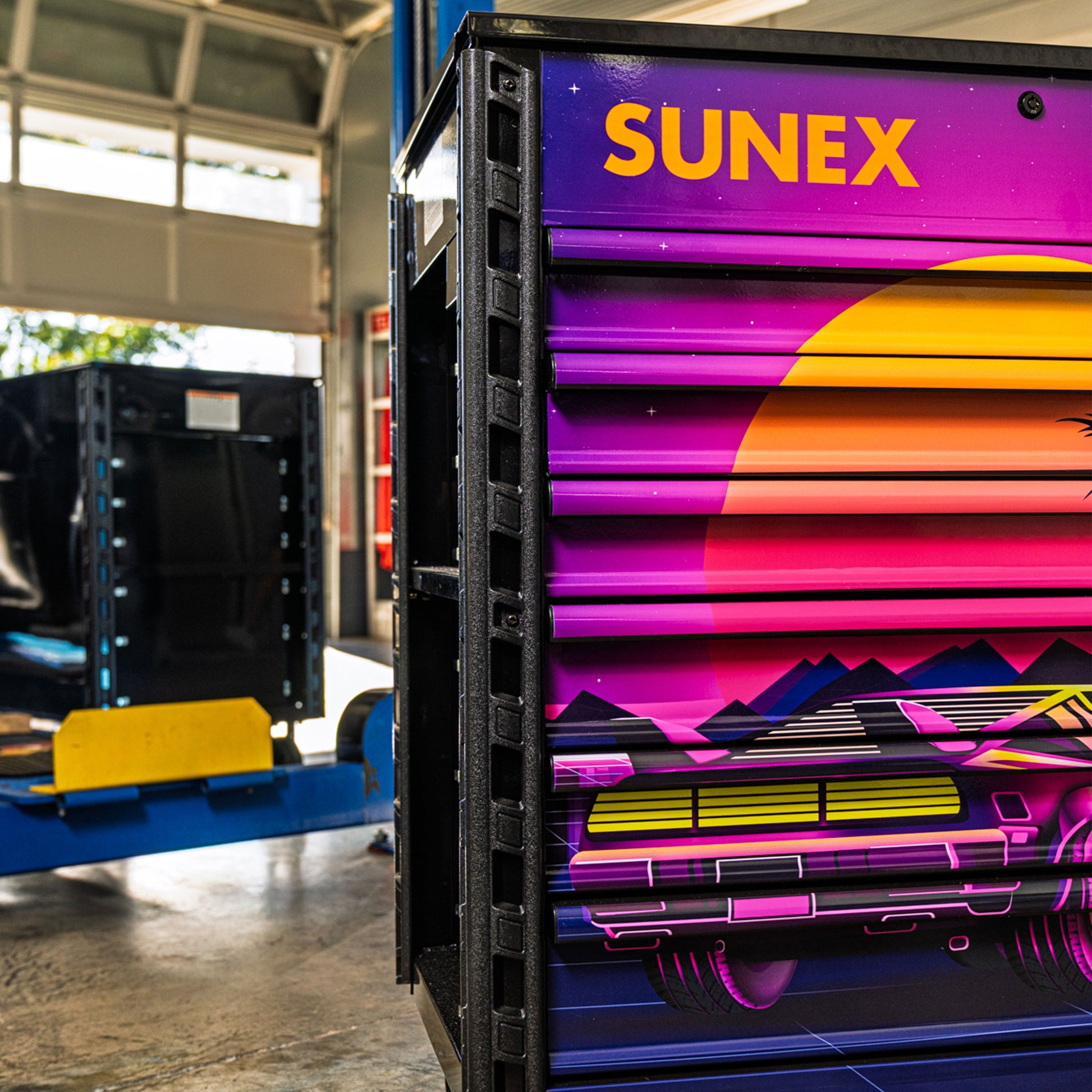 - The SUNEX Tools Premium Full Drawer Service Cart with Retro Graphics – 8057XTBKRETRO combines workshop performance with eye-catching 80s-inspired style. Built from heavy-duty 18-gauge (1.2mm) steel with a 600 lb capacity, this cart is engineered to handle demanding shop or garage environments while standing out with vibrant DeLorean, palm tree, and sunset-themed graphics in bold purple, orange, yellow, and pink hues. Designed for convenience and security, six barrel lock-secured drawers with premium latching handles protect your tools, while reinforced ball-bearing slides ensure smooth, full-extension access. A locking hinged lid with gas shocks allows for quick, effortless opening, and built-in pry bar and screwdriver holders keep essentials organized. Protective bumpers safeguard against accidental damage, and an industrial-grade powder-coated finish resists scratches and corrosion. For mobility, the cart features four swivel casters (two locking) and an adjustable side-mount handle for customizable maneuvering. Measuring 39.35” W x 21.5” D x 39.25” H, it offers versatile drawer depths for all tool sizes. Blending durable functionality with nostalgic design, the 8057XTBKRETRO is more than just a service cart—it’s a statement piece for technicians who demand performance with personality.