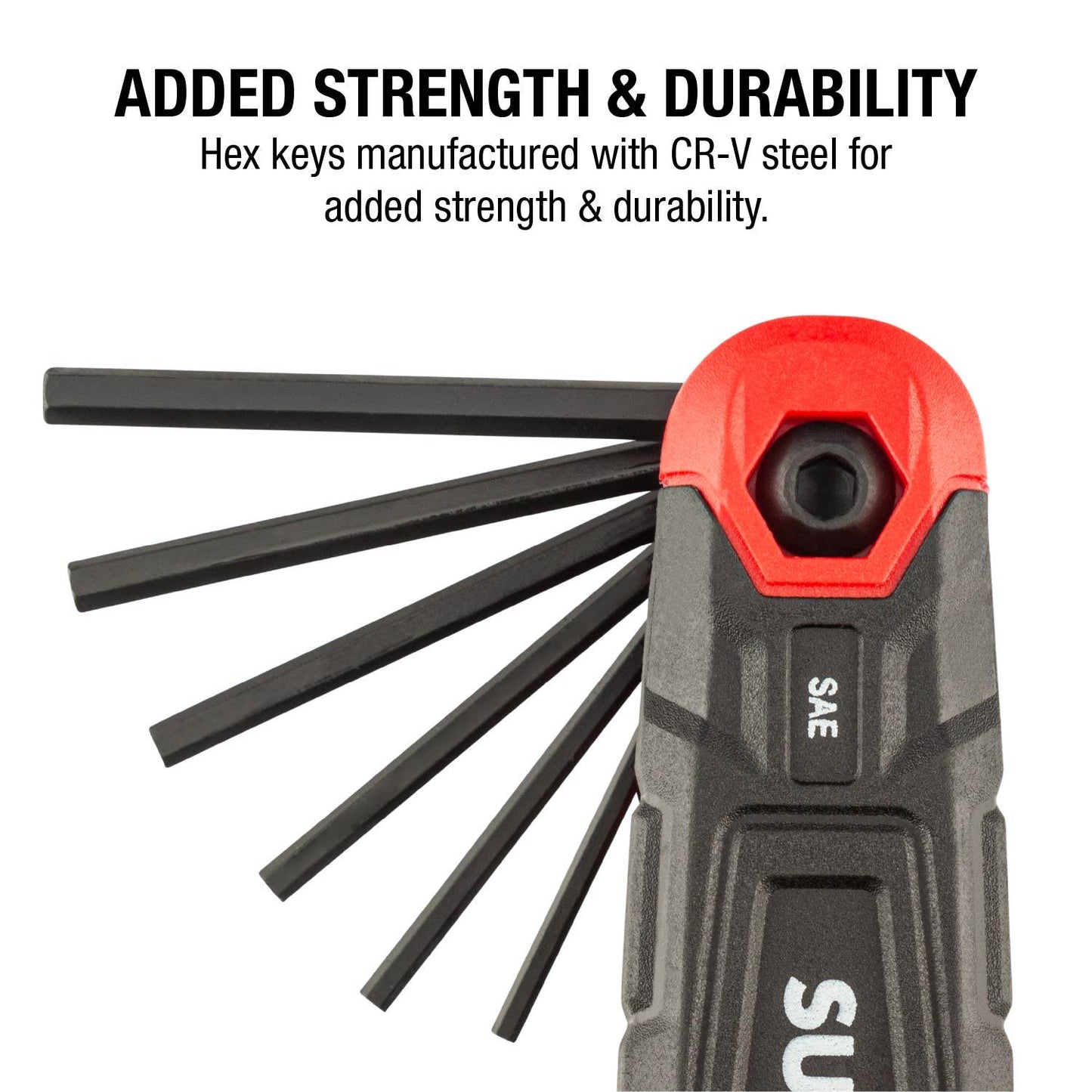 - Discover unparalleled durability and convenience with our CR-V steel hex keys. Built to last and tackle any task, our hex keys boast a caddy and folding design for effortless organization and portability. With color-coordinated packaging, easily identify SAE, Metric, and Torx sizes.