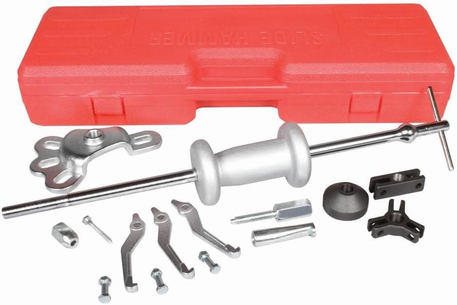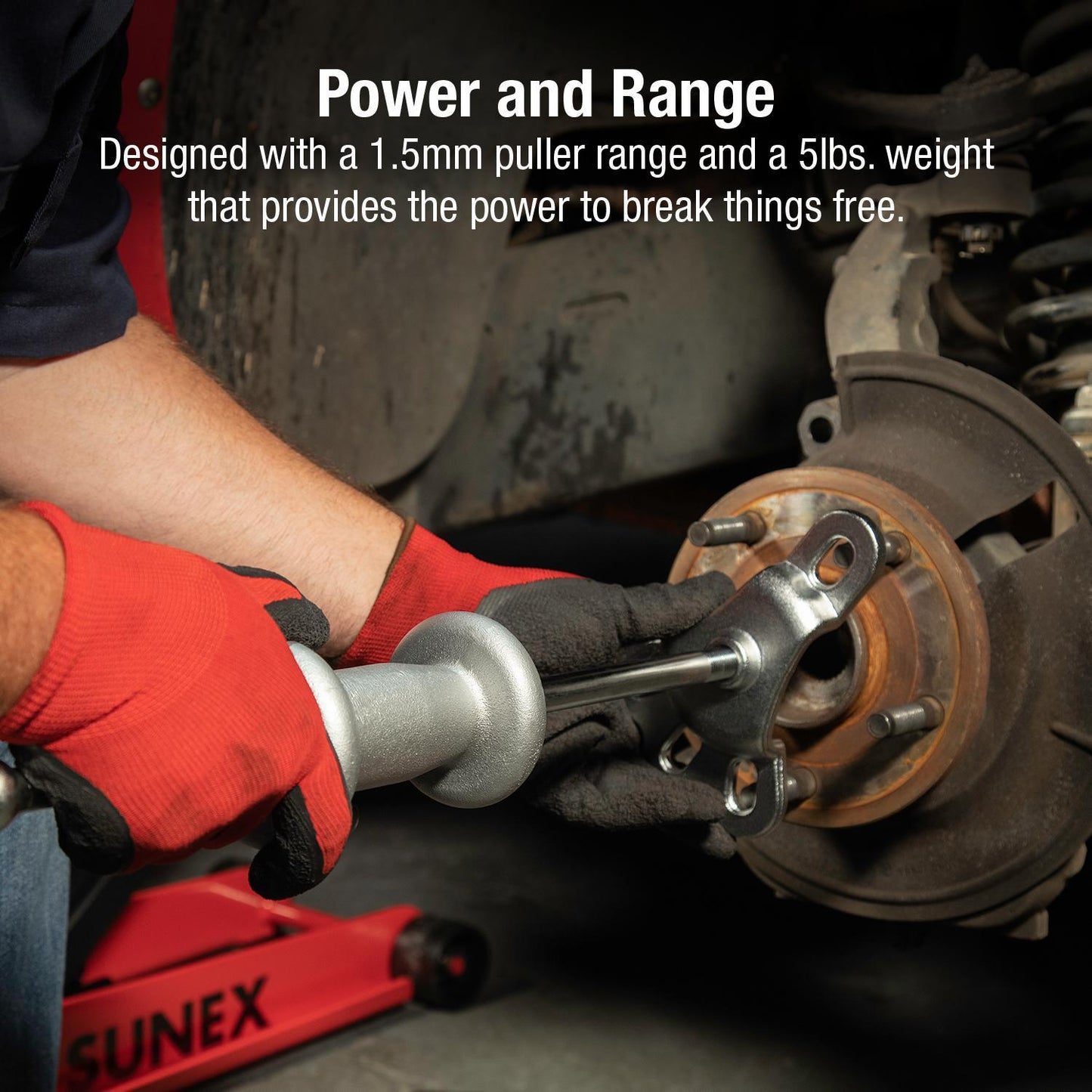 - The SUNEX Tools 3911 Slide Hammer Puller is built for powerful performance, featuring a 1.5mm puller range and a 5 lb. slide hammer weight to break stubborn parts free with ease. Its chrome-plated shaft ensures smooth operation, reducing friction for efficient pulling force. This 18-piece set includes various adapters, pullers, and attachments, making it versatile for axle, bearing, and dent removal in automotive and industrial applications. Constructed from high-quality materials, it withstands tough job site conditions. The two-jaw and three-jaw pullers provide a secure grip on different components, while the grip wrench adaptor expands its functionality. Designed for easy assembly and use, the components attach and detach quickly for seamless operation. The included heavy-duty storage case keeps everything organized, portable, and secure, making it an essential tool for professionals and DIYers.