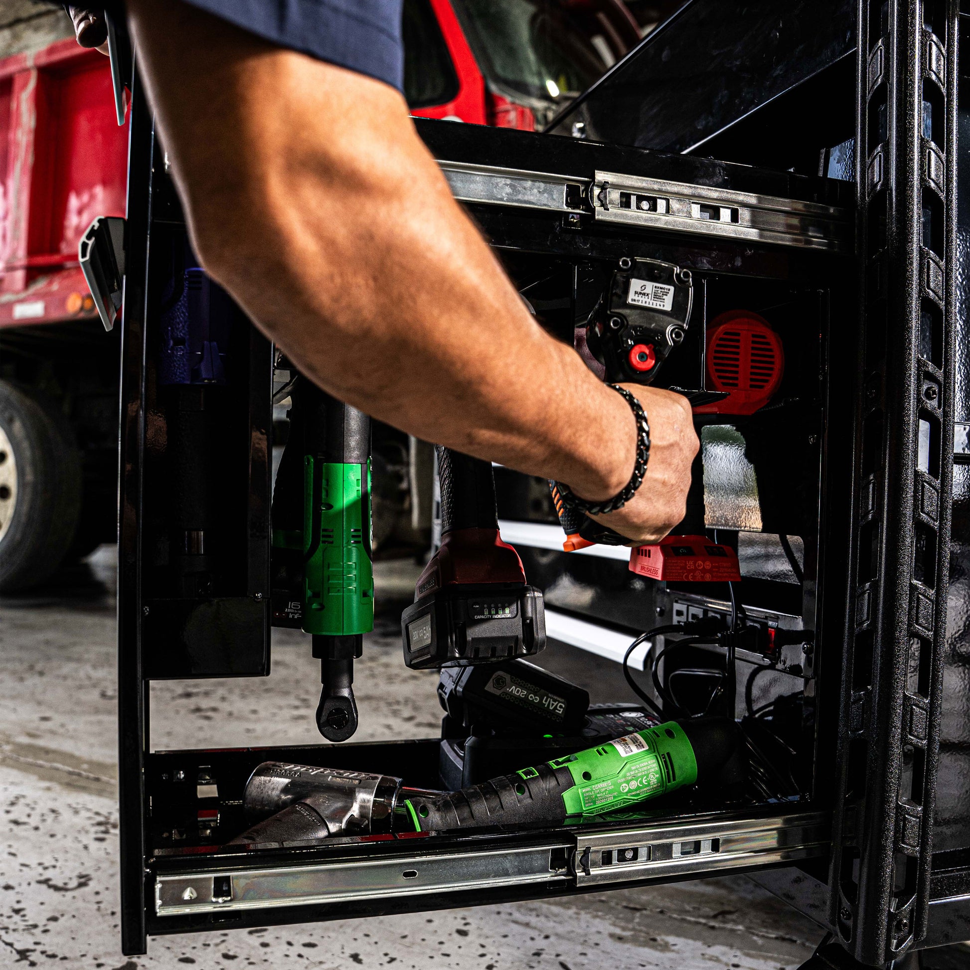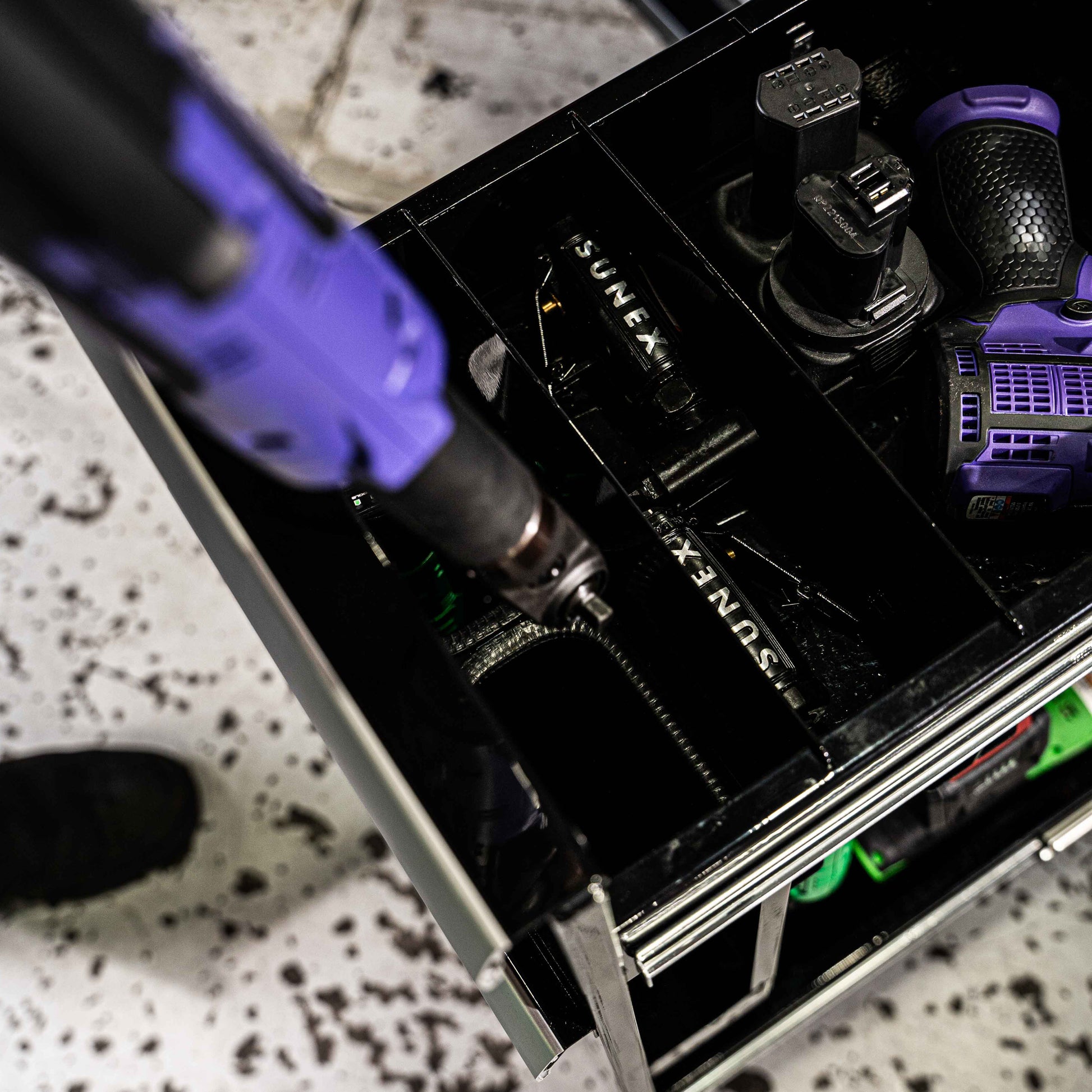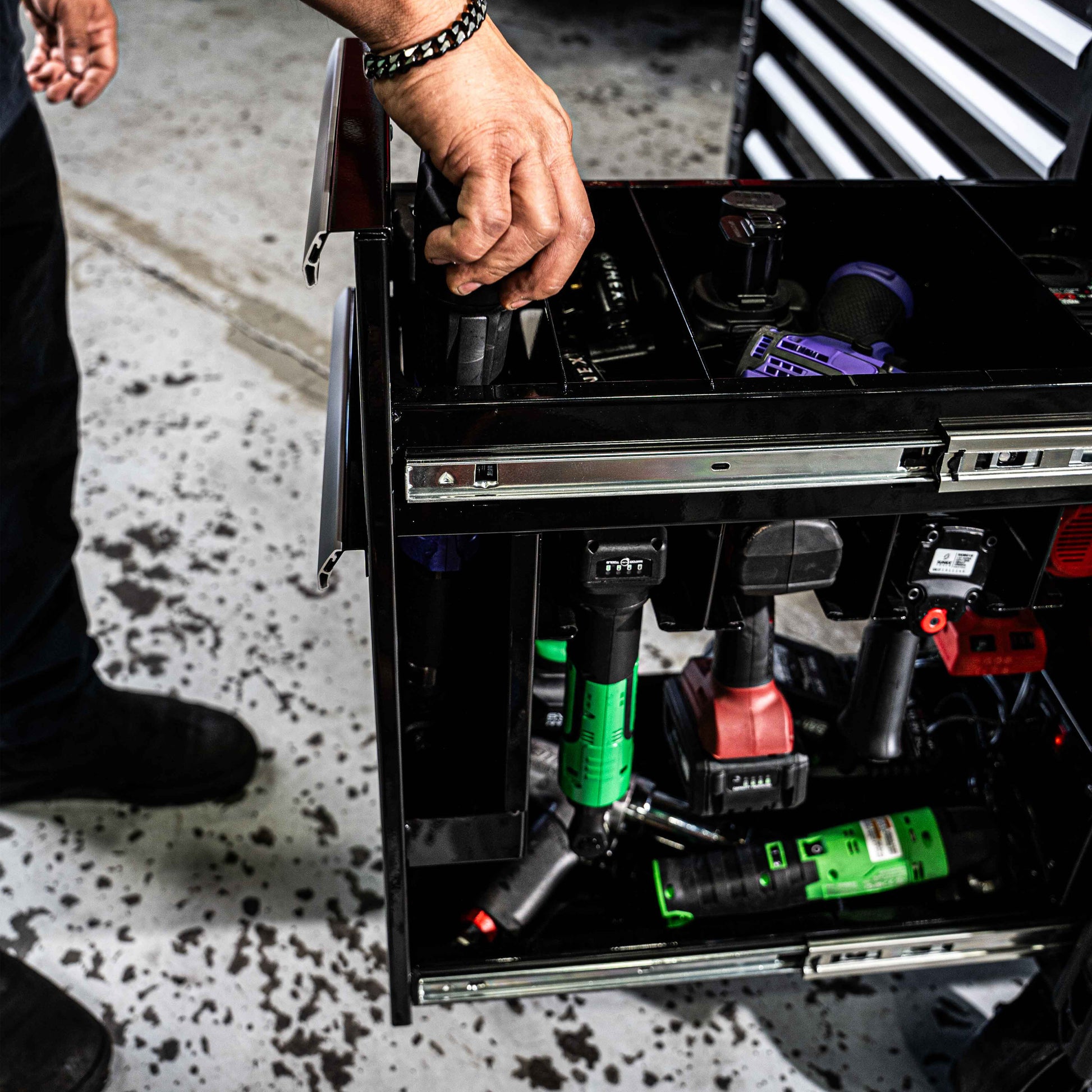- Modular Power Tool Drawer: Our modular power tool drawer can accommodate over 20 power tools, ensuring easy access and organization. Whether you're a professional or an auto enthusiast, this cart empowers you to work smarter, not harder. The distinctive ability to store and retrieve your power tools from either side of the power drawer makes it easy to keep your tools “juic’d”! It includes dedicated long reach power ratchet storage which is unique to the Juic’d BOX make this box “worth the squeeze.”
