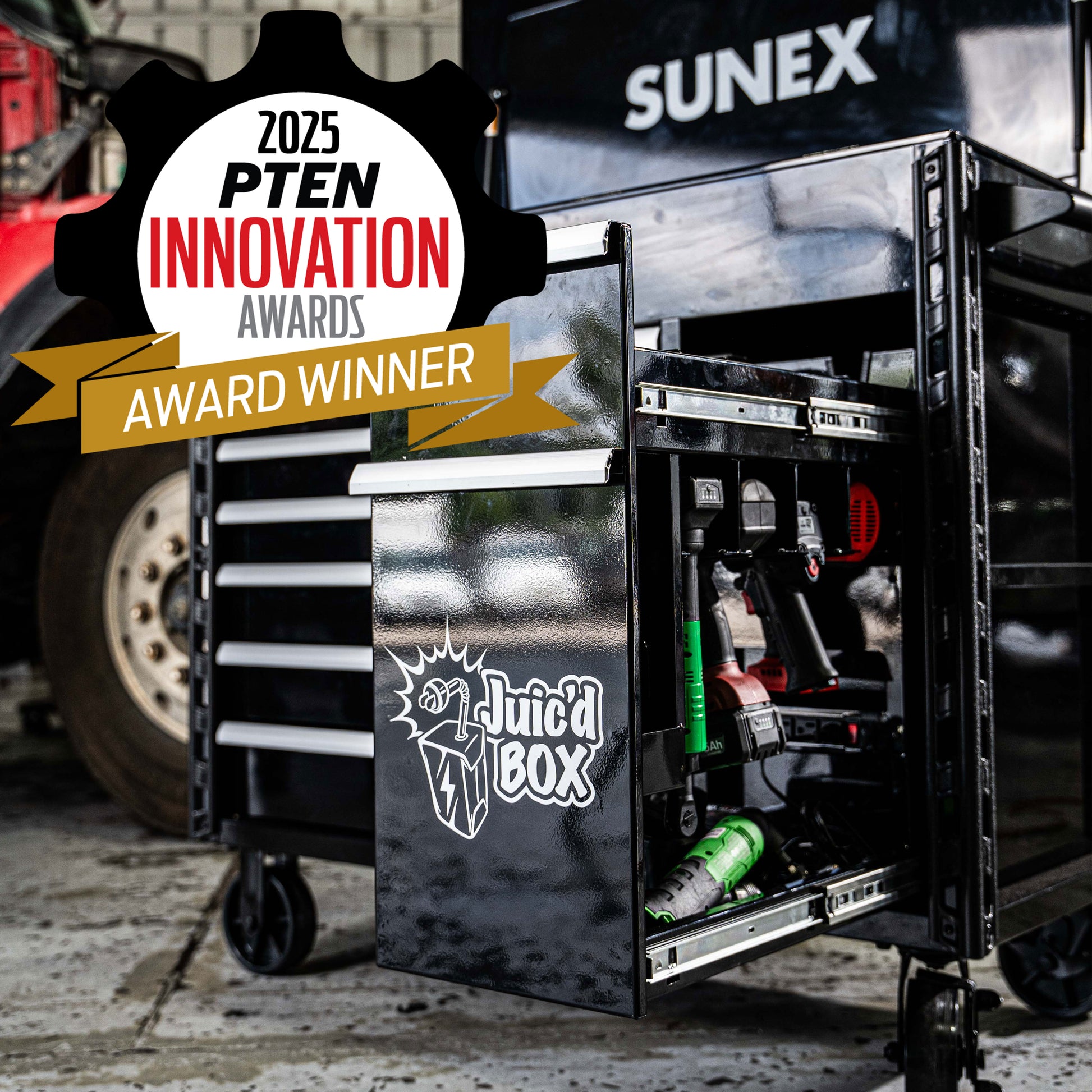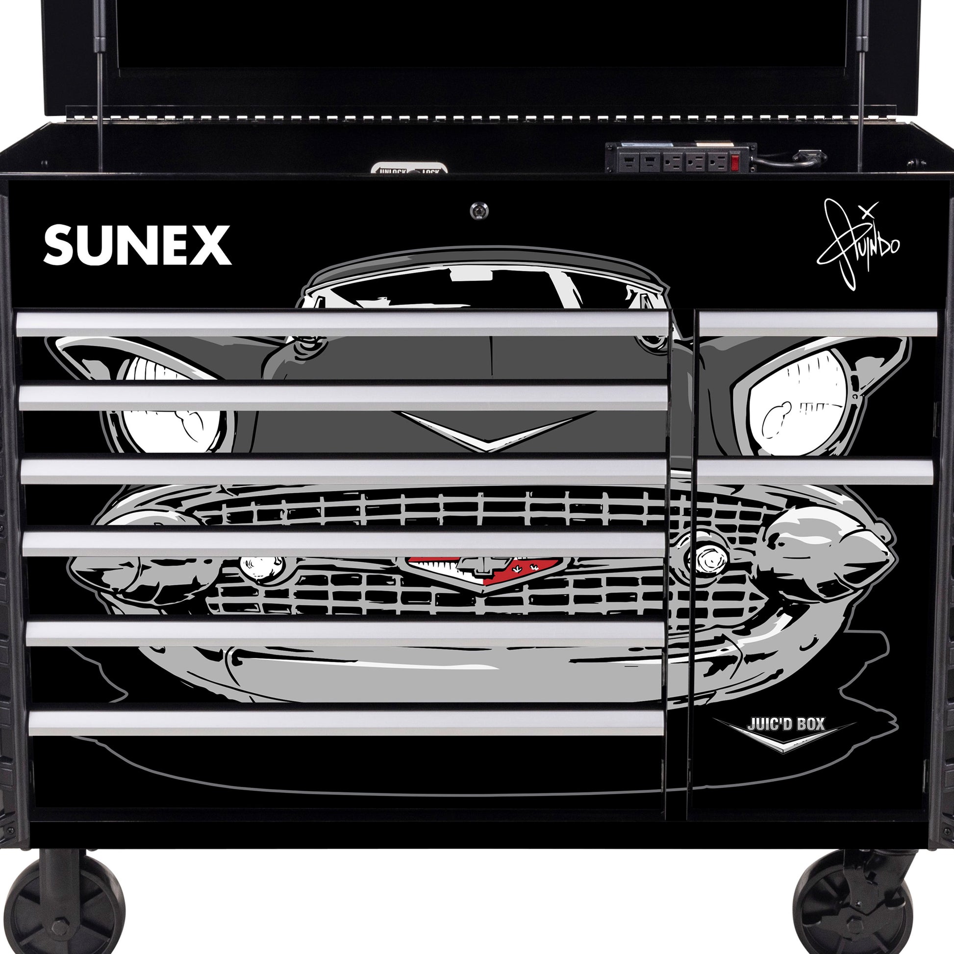 - The SUNEX Tools 8065PCBK57 “57 CHEVY Tony Squindo designed Juic’d BOX 50” 7 Drawer Powered Cart. This Tony Squindo designed cart pays homage to a true automotive icon, the ‘57 Chevy with its bold & balanced proportions, & “jet-age” styling. The renowned lowbrow, illustrator blends rebellious craftsmanship with a nod to classic automotive history. The Juic’d BOX Powered Cart is the ultimate storage and charging solution for professionals. Engineered for peak performance and convenience, this powered tool cart features dual integrated power strips with (6) 110V, (4) USB-A, and (4) USB-C outlets—charging up to 14 devices, from cordless power tools to mobile devices. The innovative modular power drawer stores 20 tools and offers exclusive dual-side access, plus dedicated long-reach ratchet storage—keeping your gear organized, accessible, and always “Juic’d.” 7 fully extendable, lockable drawers with barrel locks provide secure storage, while gas piston-assisted lid operation ensures smooth, reliable access. Designed for rugged use, the cart rolls on four heavy-duty 6" casters (2 swivel-locking, 2 fixed) and features corner bumpers to protect vehicles and surfaces. With a flexible handle mount, the 50" Juic’d BOX adapts to your shop layout, while dedicated pry bar storage and a spacious top compartment maximize organization.