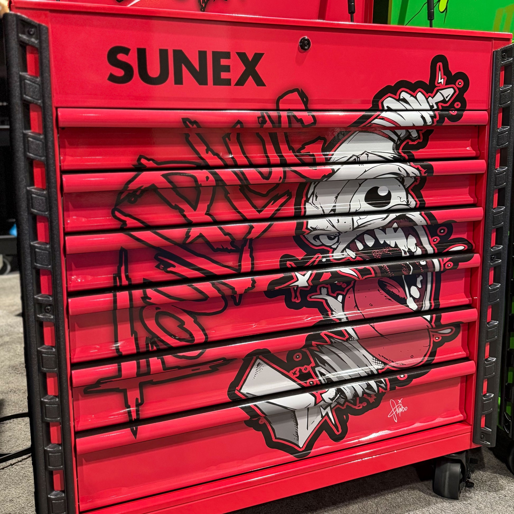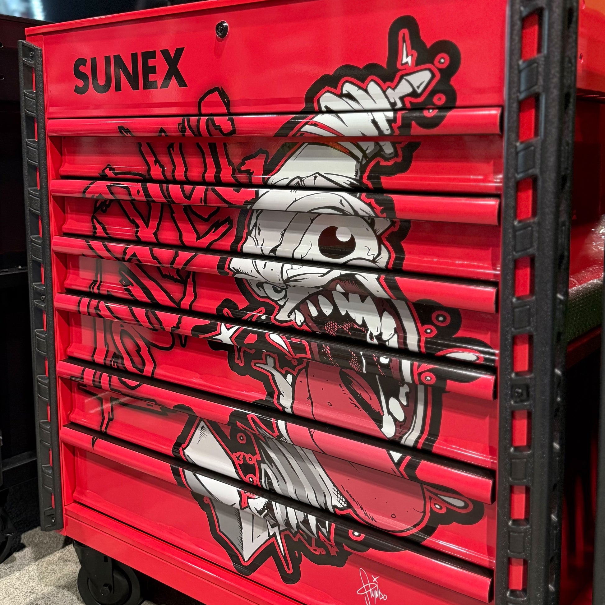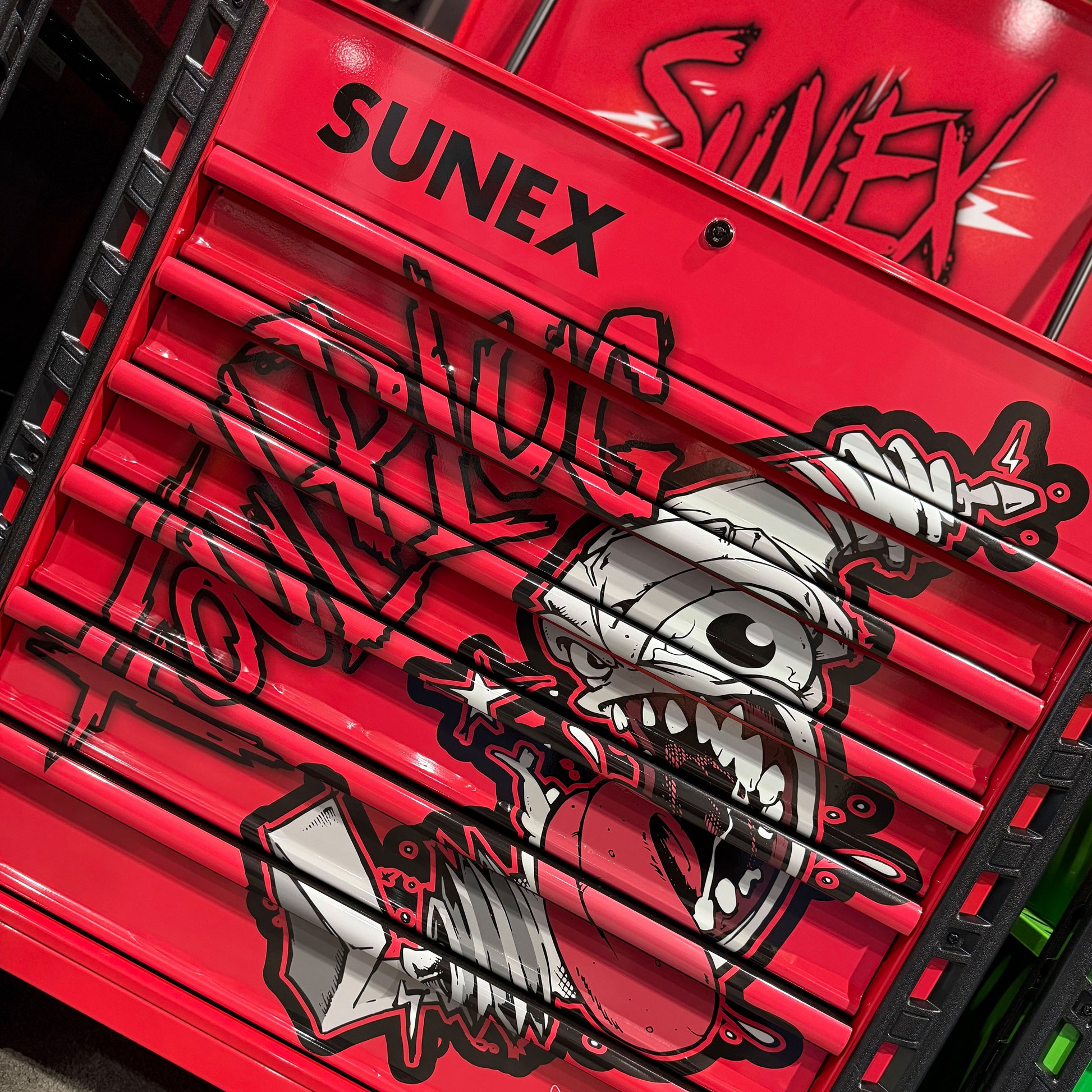 - The SUNEX Tools 8057XTRFOUL “FOUL PLUG” Tony Squindo designed Premium Full Drawer Service Cart. This Tony Squindo designed cart is a nod to the insidious spark plug that is carbon-caked, oil-soaked and who just won’t fire right. This gremlin of combustion comes to life in a vibrant, chaotic illustration that’s part misfire, part masterpiece. The renowned lowbrow, illustrator blends rebellious craftsmanship with a nod to classic automotive history. Crafted from durable 18-gauge (1.2mm) steel with a 600 lb capacity to withstand demanding environments. Designed for maximum convenience, gas shocks effortlessly lift the locking hinged lid, ensuring quick access to tools while keeping them secure. Six barrel lock-secured drawers with premium latching handles provide superior protection for your valuable equipment. Keep essentials neatly stored with built-in pry bar and screwdriver holders, while protective bumpers shield the cart from accidental damage. Smooth mobility is guaranteed with four swivel casters (two locking) and an adjustable handle that mounts on either side for customizable use. The industrial-grade powder coating enhances durability, preventing scratches and corrosion. With reinforced ball-bearing drawer slides, this cart delivers smooth, full-extension access for effortless tool retrieval. Measuring 39.35” W x 21.5” D x 39.25” H, it offers ample storage with various drawer depths. Whether in a shop or garage, this service cart is built to perform.