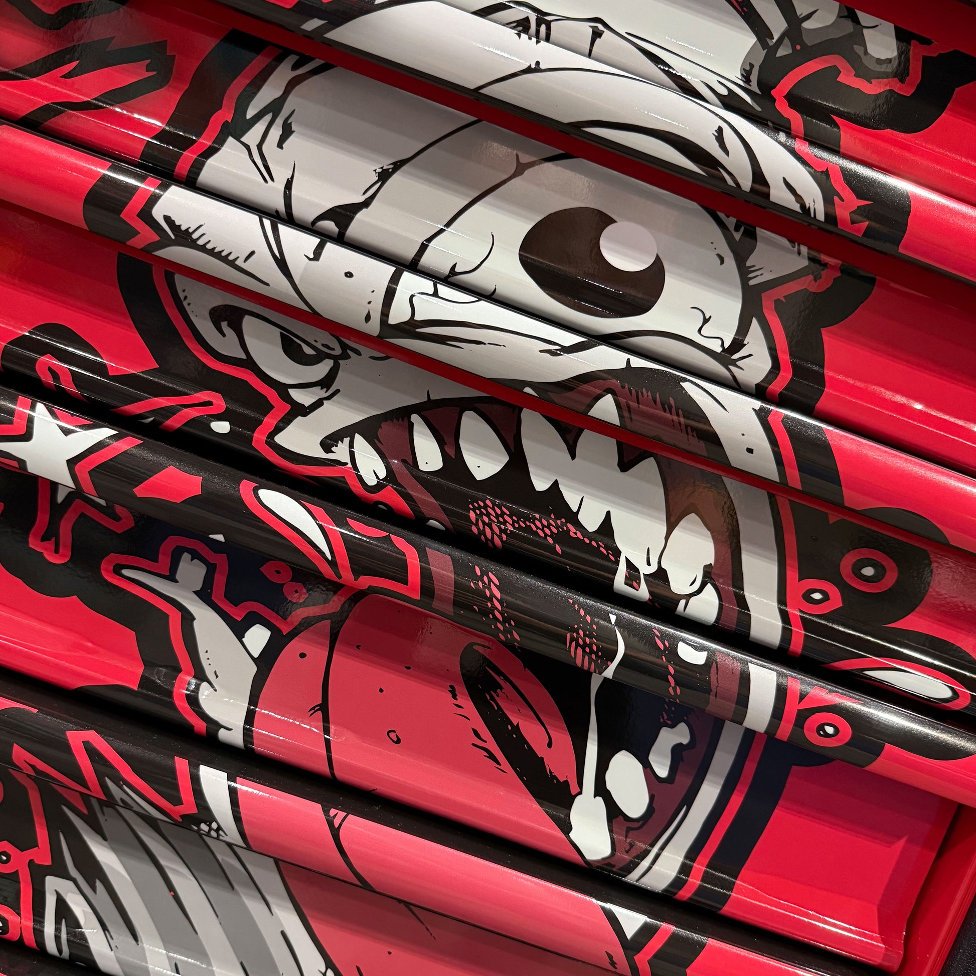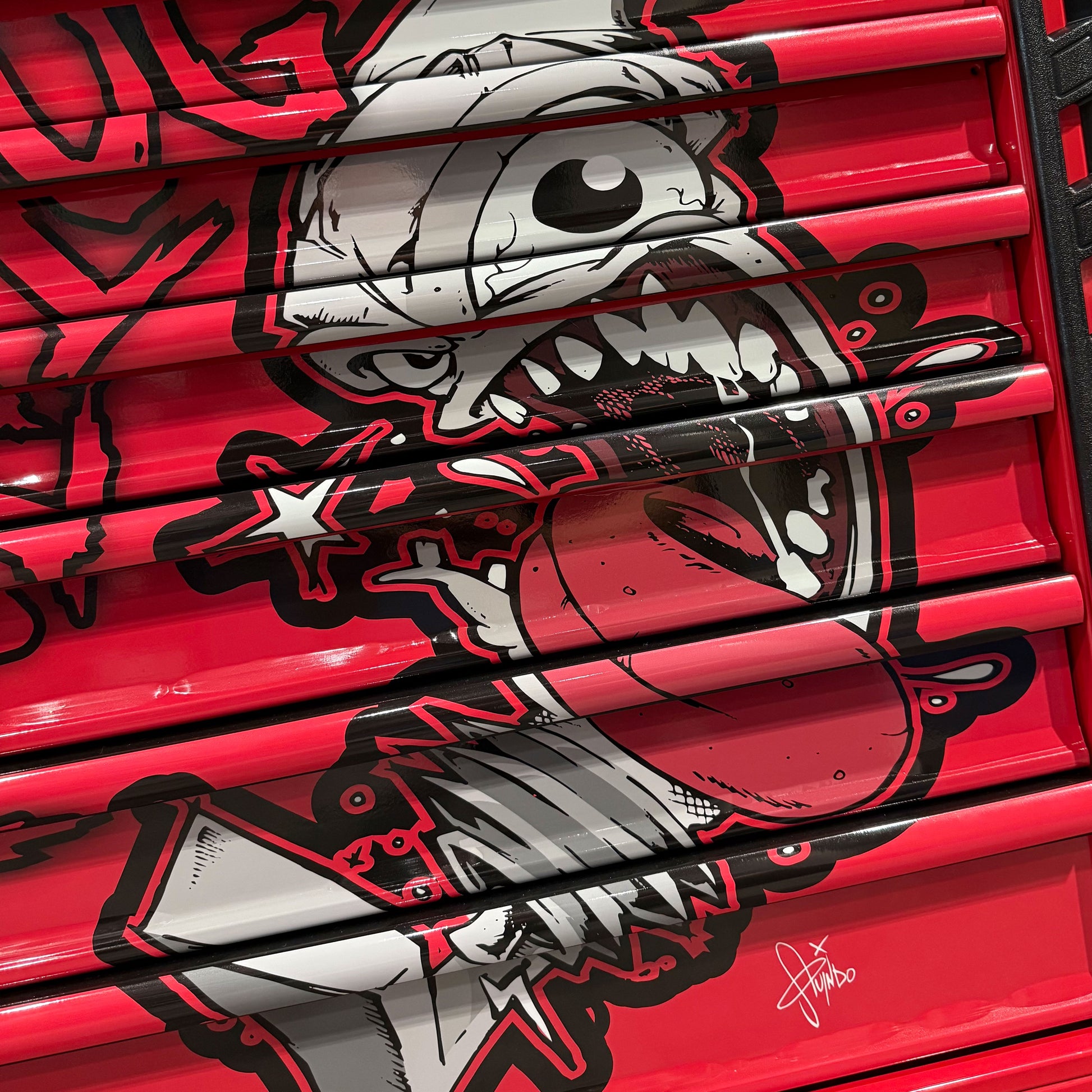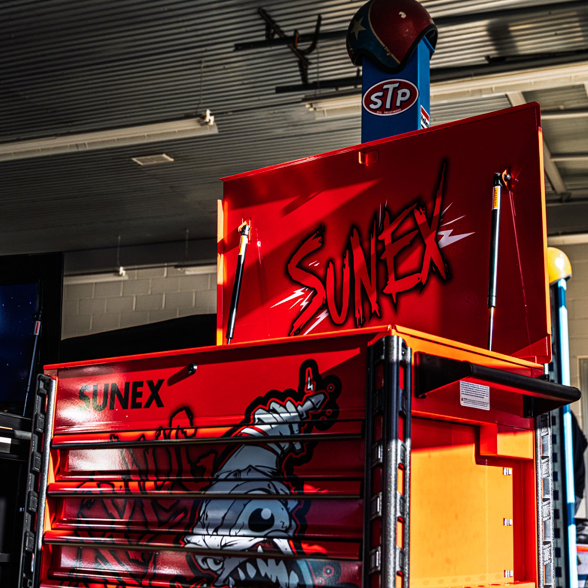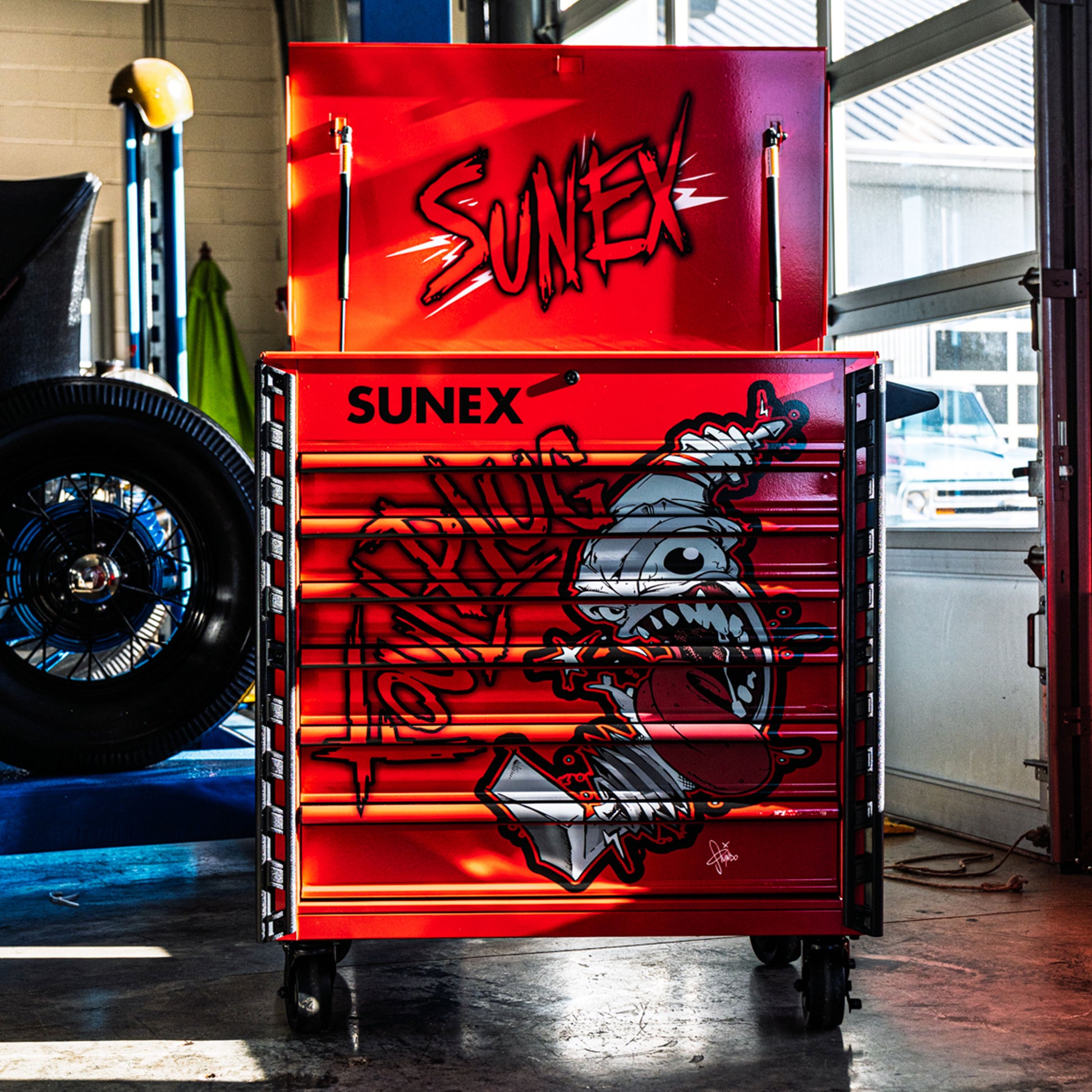 - The SUNEX Tools 8057XTRFOUL “FOUL PLUG” Tony Squindo designed Premium Full Drawer Service Cart. This Tony Squindo designed cart is a nod to the insidious spark plug that is carbon-caked, oil-soaked and who just won’t fire right. This gremlin of combustion comes to life in a vibrant, chaotic illustration that’s part misfire, part masterpiece. The renowned lowbrow, illustrator blends rebellious craftsmanship with a nod to classic automotive history. Crafted from durable 18-gauge (1.2mm) steel with a 600 lb capacity to withstand demanding environments. Designed for maximum convenience, gas shocks effortlessly lift the locking hinged lid, ensuring quick access to tools while keeping them secure. Six barrel lock-secured drawers with premium latching handles provide superior protection for your valuable equipment. Keep essentials neatly stored with built-in pry bar and screwdriver holders, while protective bumpers shield the cart from accidental damage. Smooth mobility is guaranteed with four swivel casters (two locking) and an adjustable handle that mounts on either side for customizable use. The industrial-grade powder coating enhances durability, preventing scratches and corrosion. With reinforced ball-bearing drawer slides, this cart delivers smooth, full-extension access for effortless tool retrieval. Measuring 39.35” W x 21.5” D x 39.25” H, it offers ample storage with various drawer depths. Whether in a shop or garage, this service cart is built to perform.